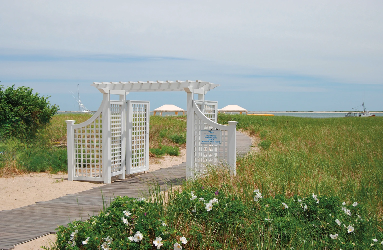 A modified Garden Arbor with a wide arch welcomes guests of the Chatham Bars Inn to the resort's private beach. The lattice panels and gates are a perfect complement to the beach atmosphere, while maintaining a luxury look and feel.
