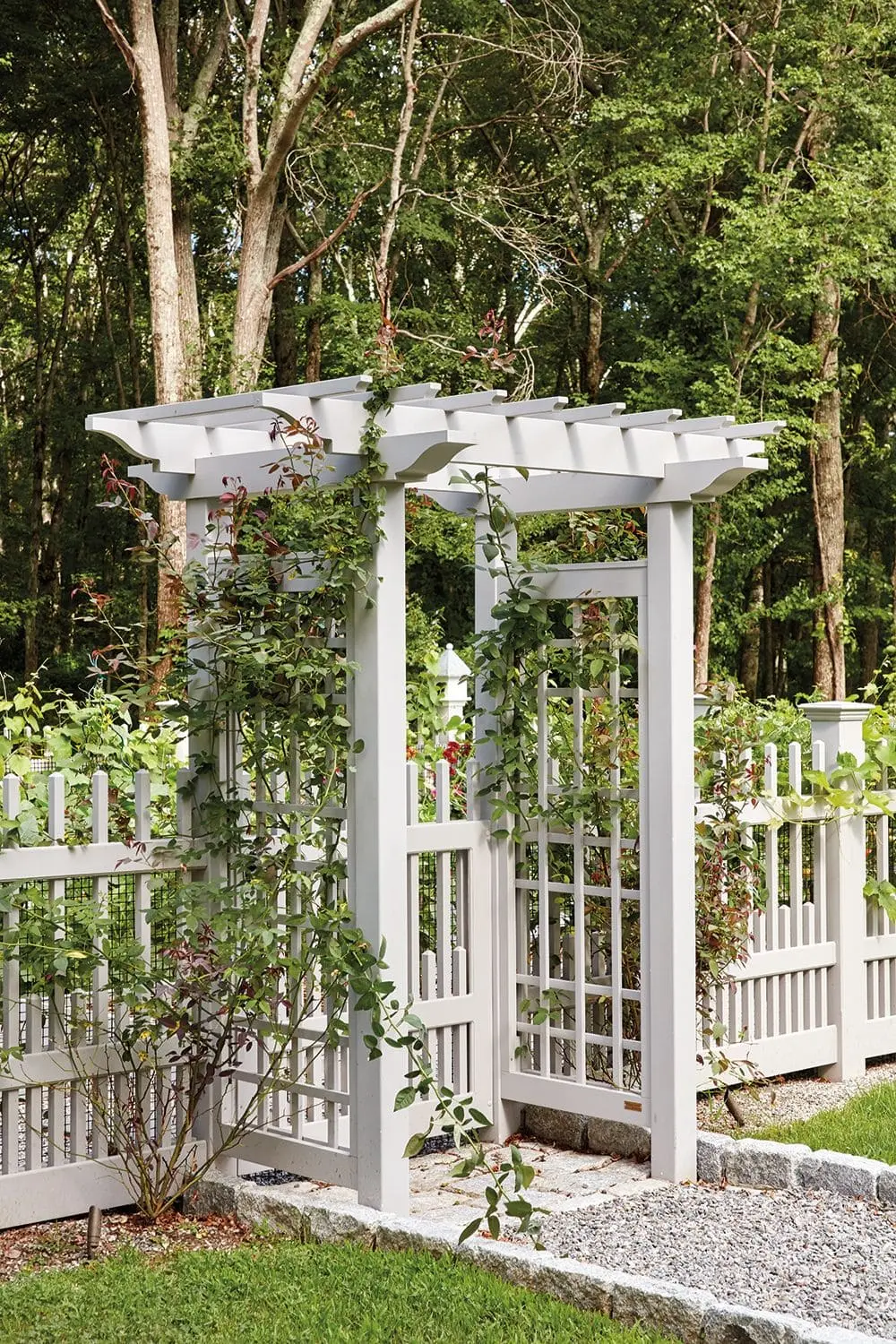 This pathway entrance is highlighted by a 3.5' wide Garden arbor with an attached gate that provides entrance to the Westchester picket fence garden enclosure.