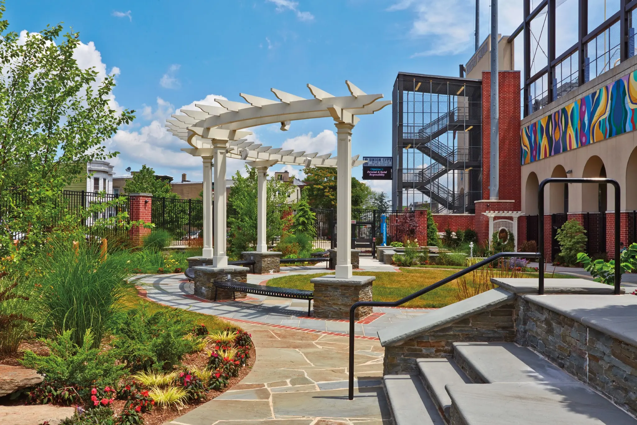 Our custom radius pergola creates a dramatic architectural impact in the updated common gathering area at the Union City high school in New Jersey. This project also includes a lattice panel to complement the design of the courtyard pergola.