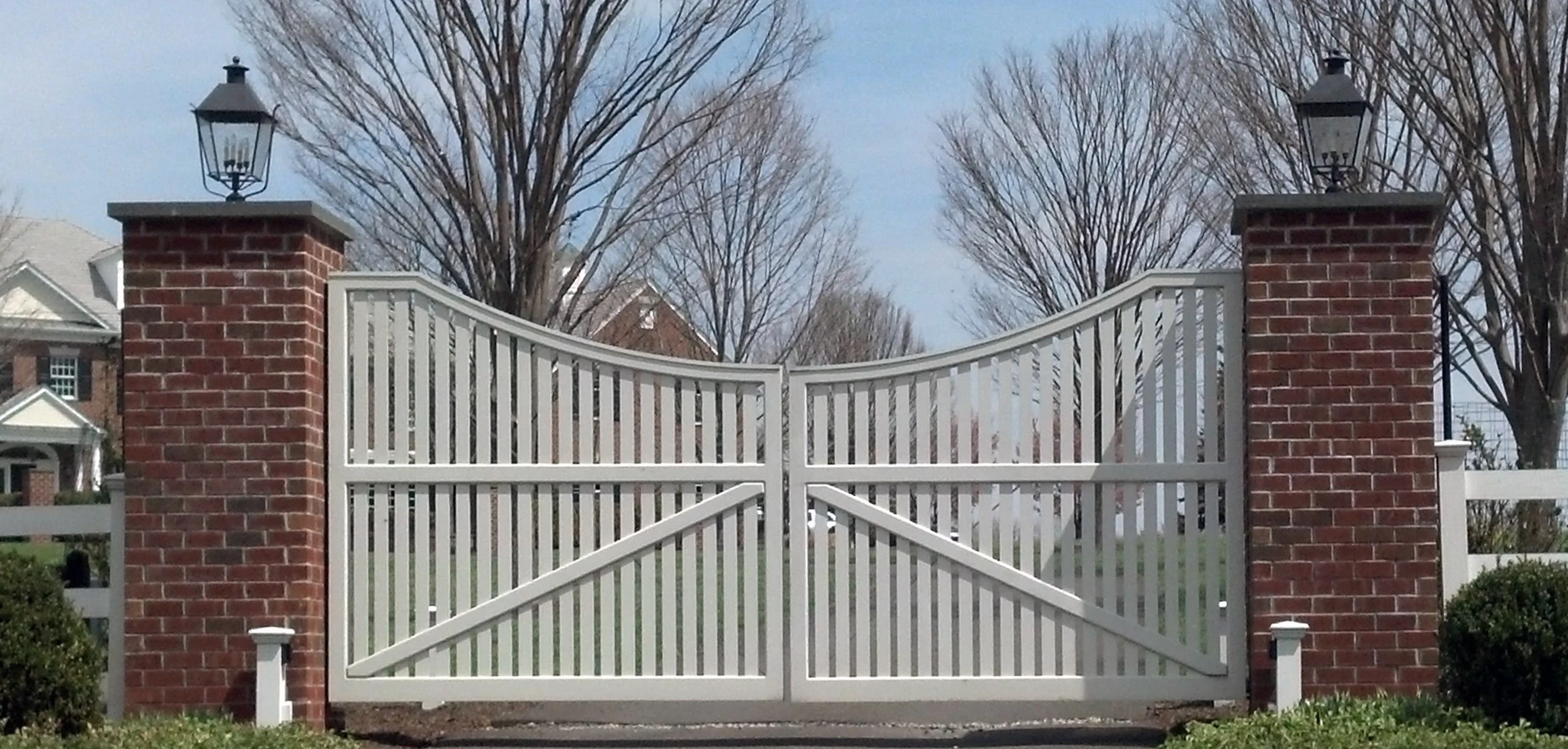 Convex Capped Picket Drive Gate with Brick Pillar Posts
