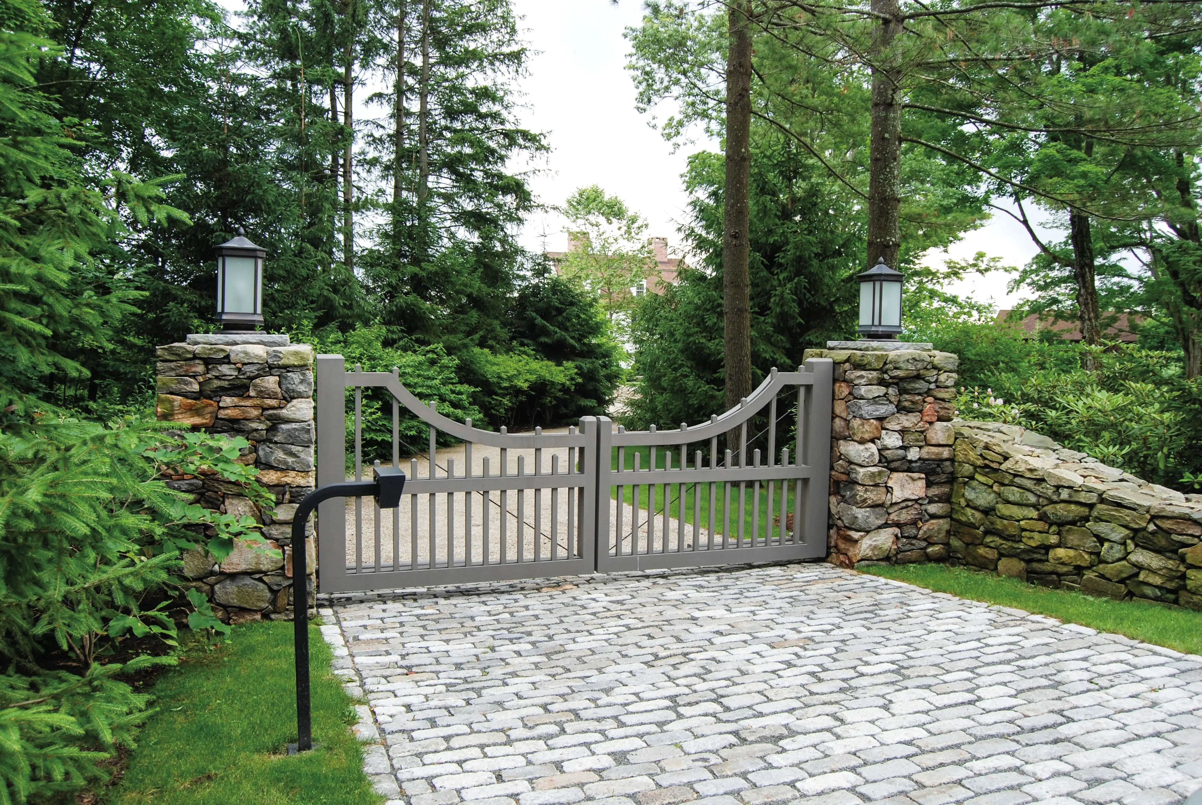 Housed securely between stone pillars and crafted from sturdy, enduring solid cellular vinyl with a strong supporting frame, this picket drive gate features a distinctive end curve top rail.