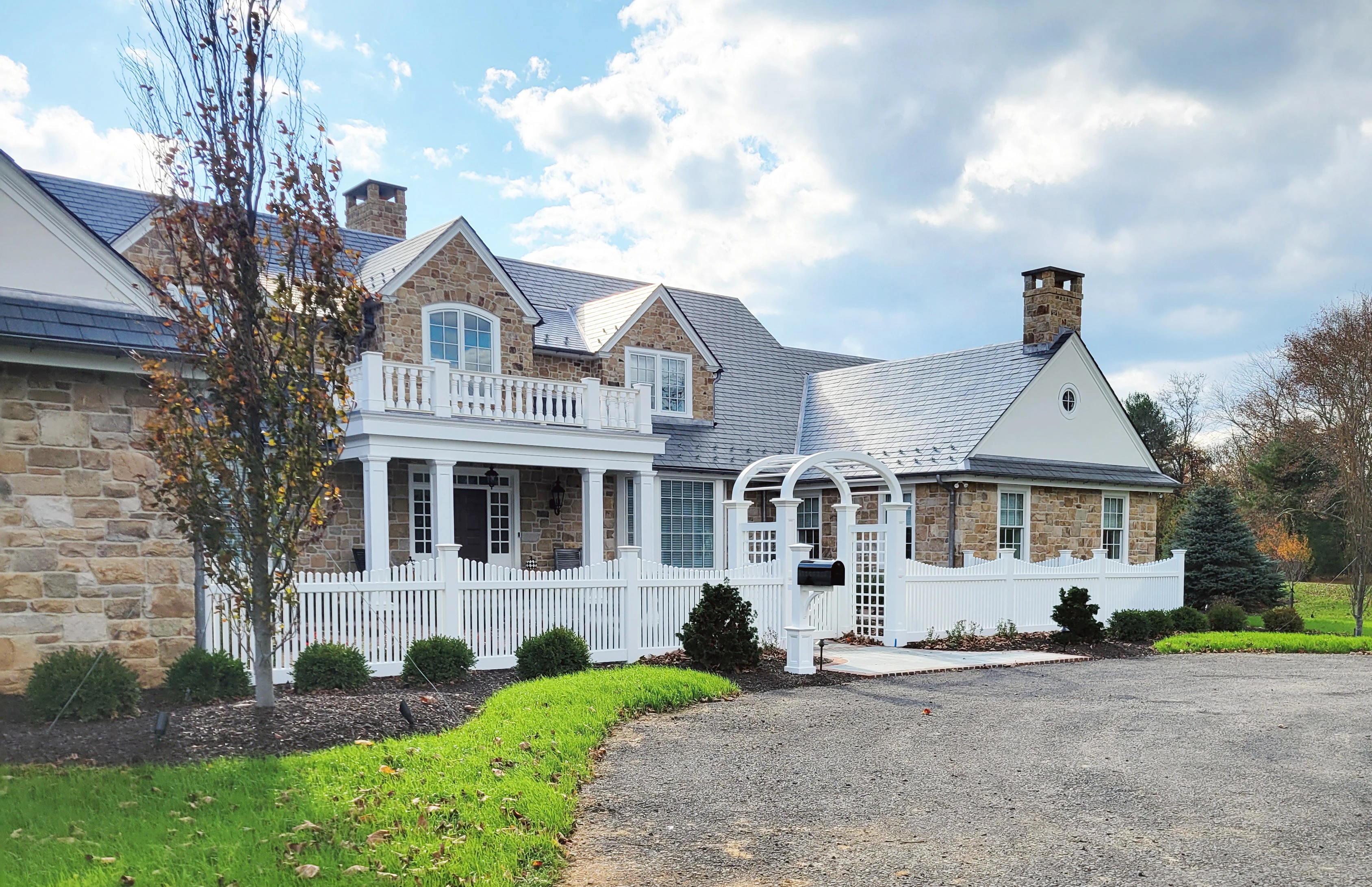 This 4' high Chestnut Hill scallop picket fence creates a beautiful front yard perimeter. The look is completed with a custom arbor and double walk gate.