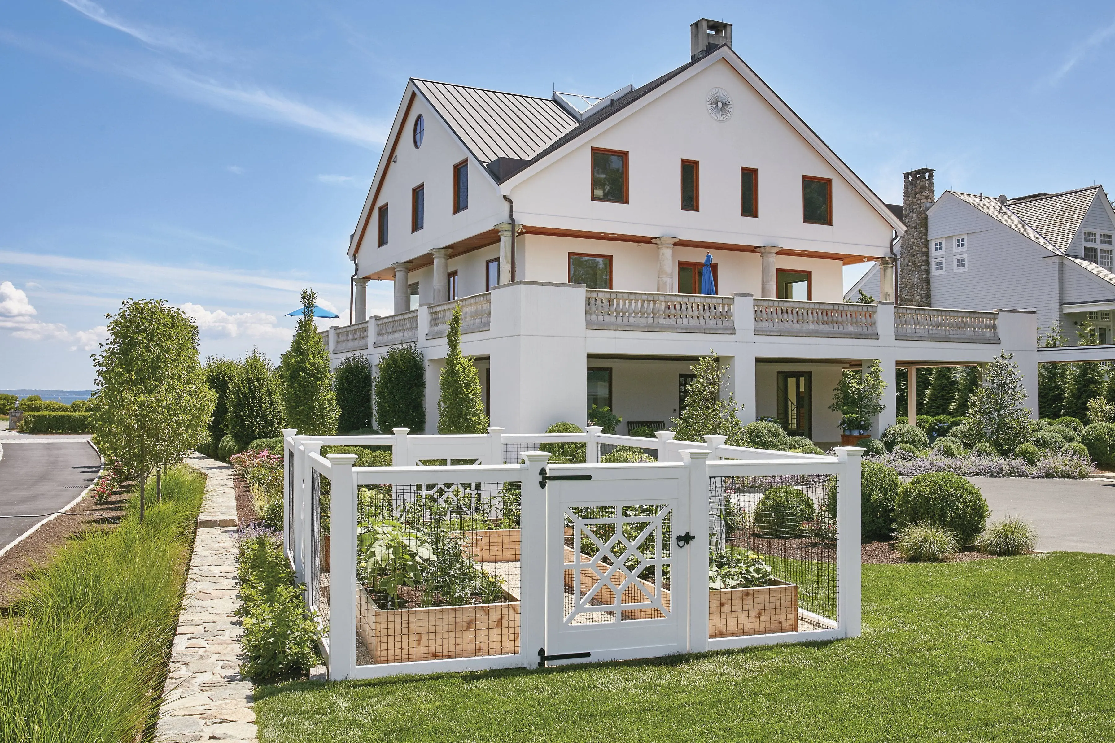 Adding sophistication and charm to this Walpole Sag Harbor garden enclosure is the homeowners' choice of three Walpole Chippendale style side panels and a complementing Chippendale pathway gate. These come with Walpole's rugged, rust-resistant gate hardware. The raised beds are protected by wire mesh attached to sturdy fence posts and bottom rails. The enclosure is crafted in low maintenance solid cellular vinyl.
