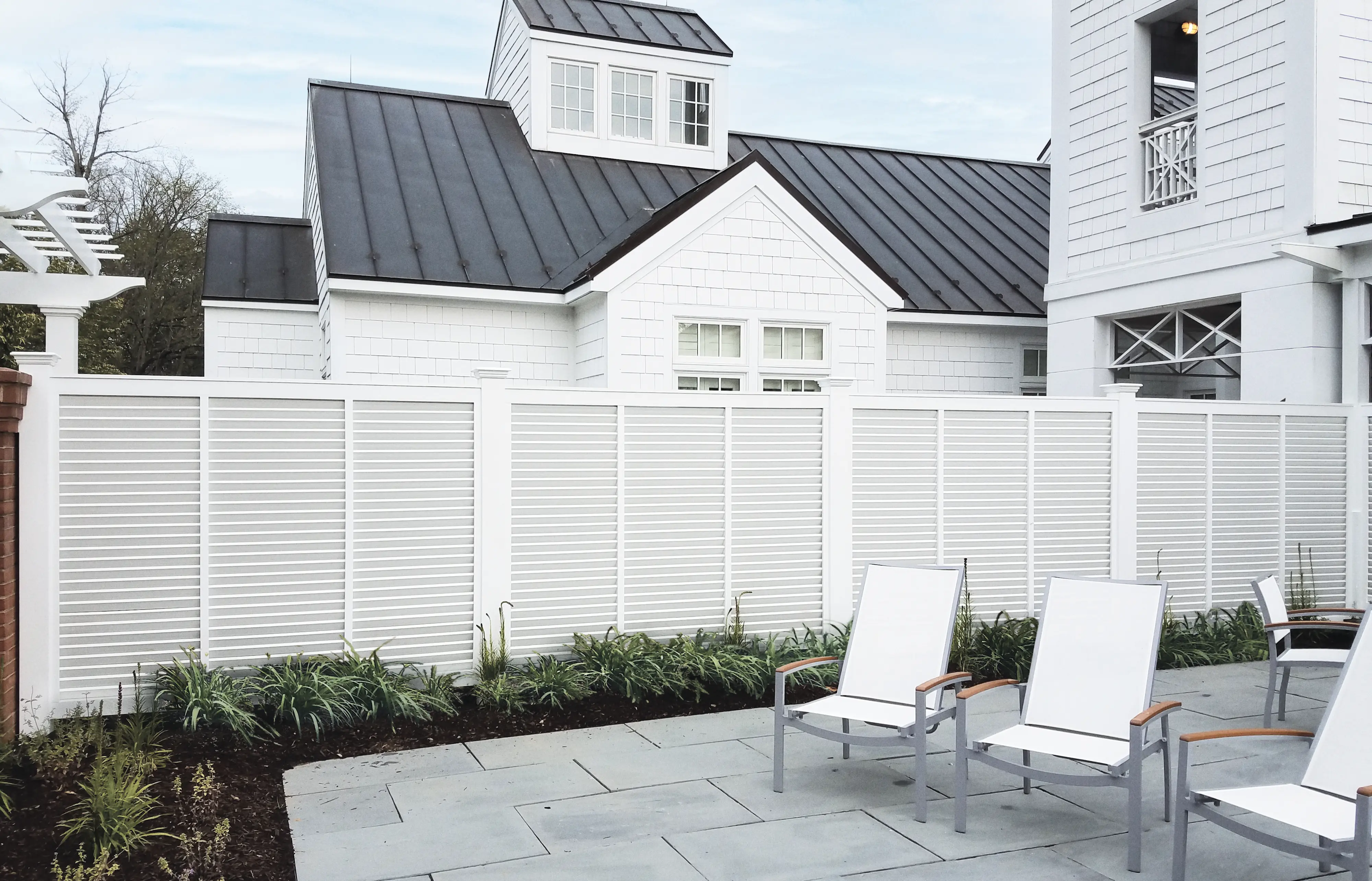 Walpole Outdoors worked closely with The Inn at Perry Cabin to create a custom set of fences and outdoor structures that are befitting of the five-star luxury resort. This custom louvered fence, crafted in solid cellular vinyl, creates an elegant privacy barrier for resort guests.