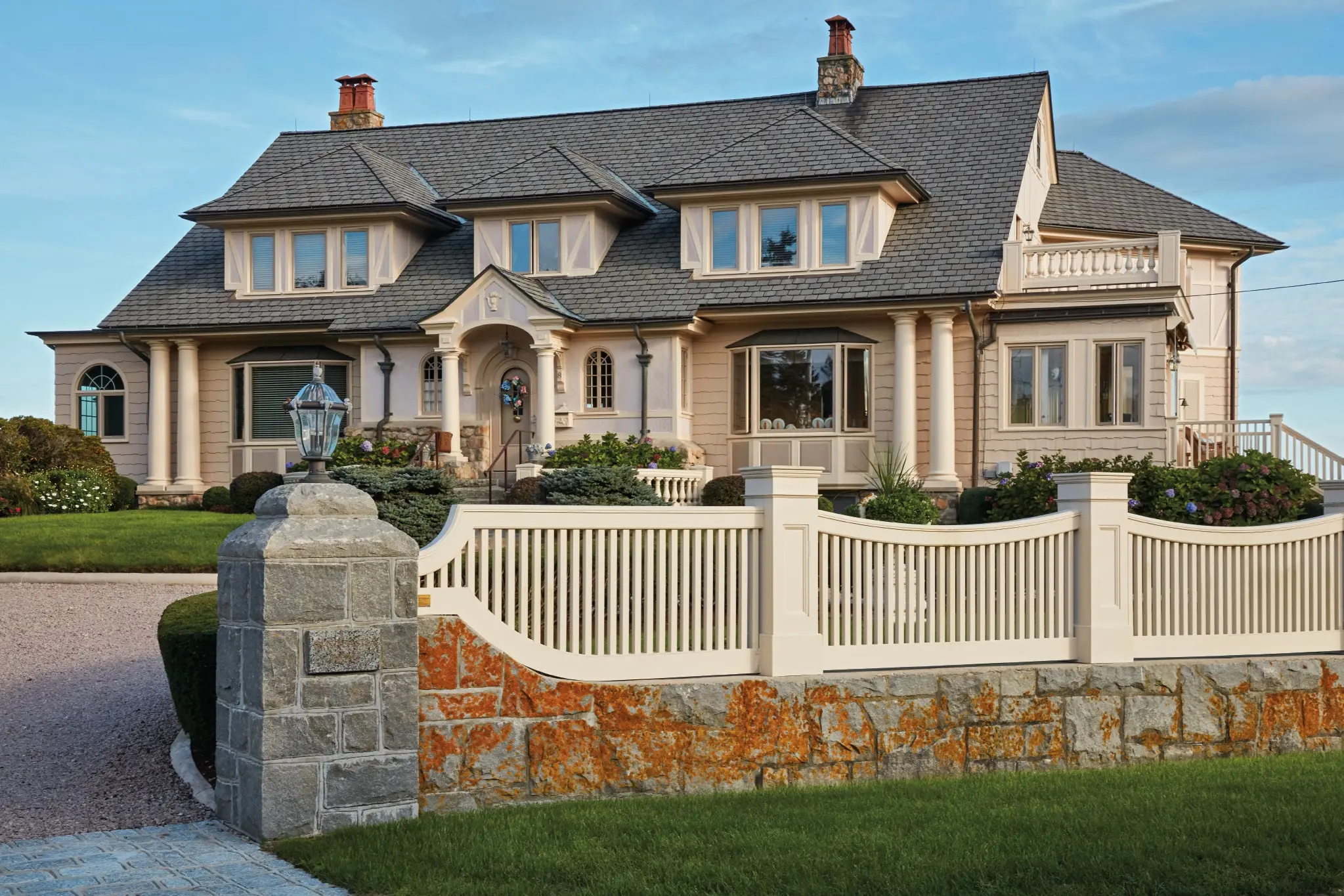 Secured atop a stone wall, the gently curving sections of this custom Yorktown fence stand 3 feet high. On one side of the driveway is a complementing majestic Yorktown section that curves up to 6 feet tall. Supporting the wall fence are substantial 12" square Wenham pillar posts with steel cores. Fence features includes kickboards, fascia, and posts with Walpole's Westport caps. Walpole factory prefinished the solid cellular vinyl Yorktown fence with two coats of Sherwin-Williams VinylSafe Navajo White paint that comes with a 25-year warranty.