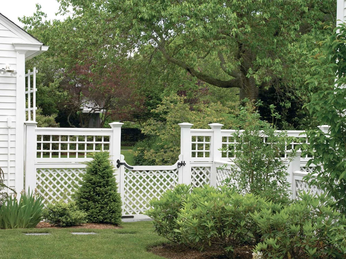 A Walpole Outdoors' detailed replication of an historical fence, this design features a horizontal vertical lattice topper with a diagonal lattice base. The fence continues seamlessly with the custom walk gate.