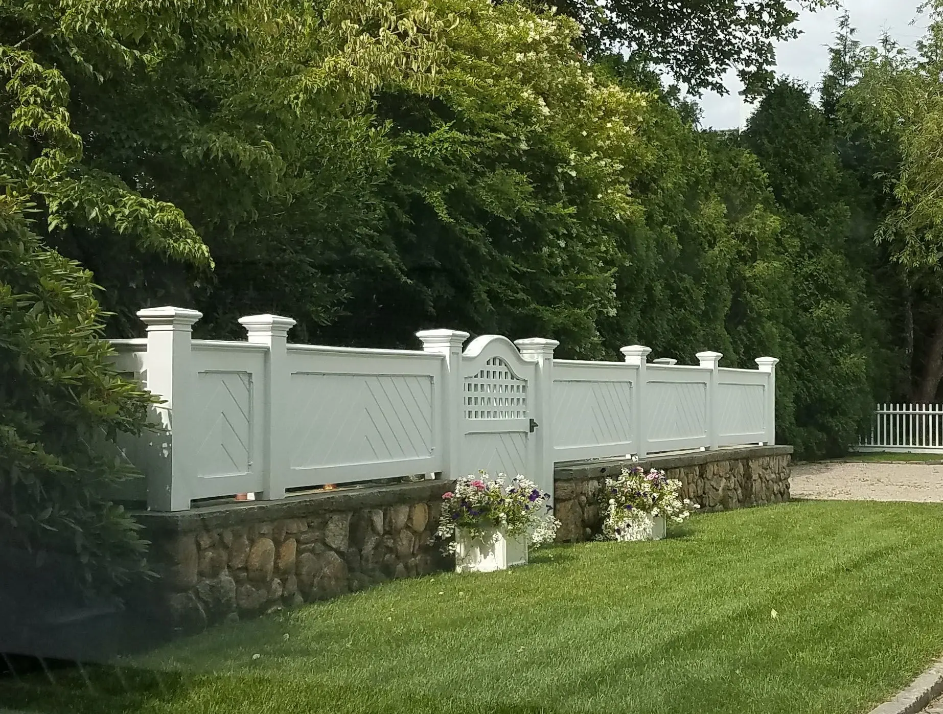 A unique take on a board fence, this custom herringbone design is perched on a stone wall to create a charming privacy barrier to this garden area. The arch top gate with custom lattice topper perfects the look.