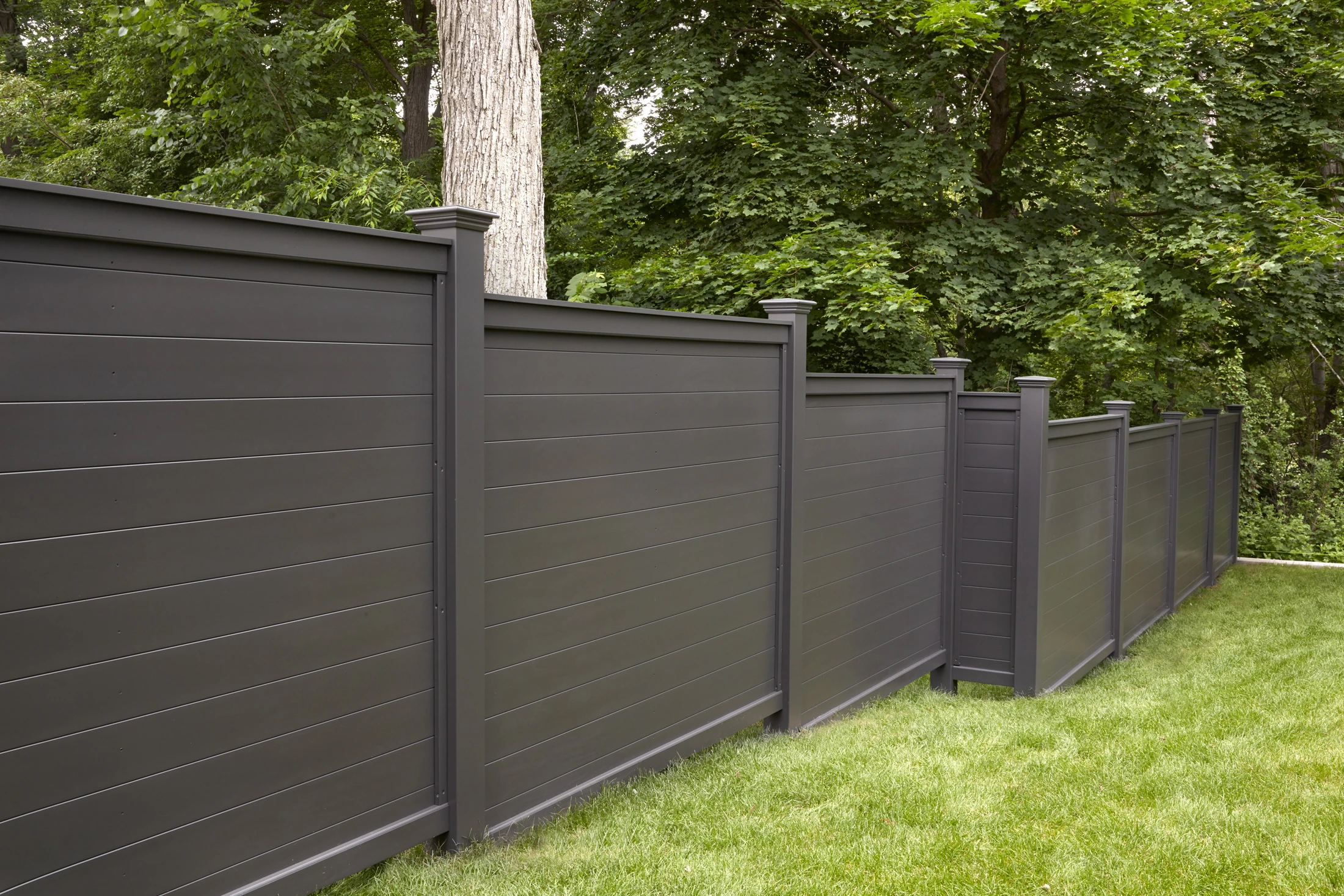 Sleek, modern, and made for privacy, the Horizontal Universal Board Fence in Iron Ore delivers a bold contemporary look that perfectly complements today’s architectural styles. Installed with a stepped design to follow the natural grade of the home's perimeter, this fence creates a clean, structured border while adapting seamlessly to the landscape.