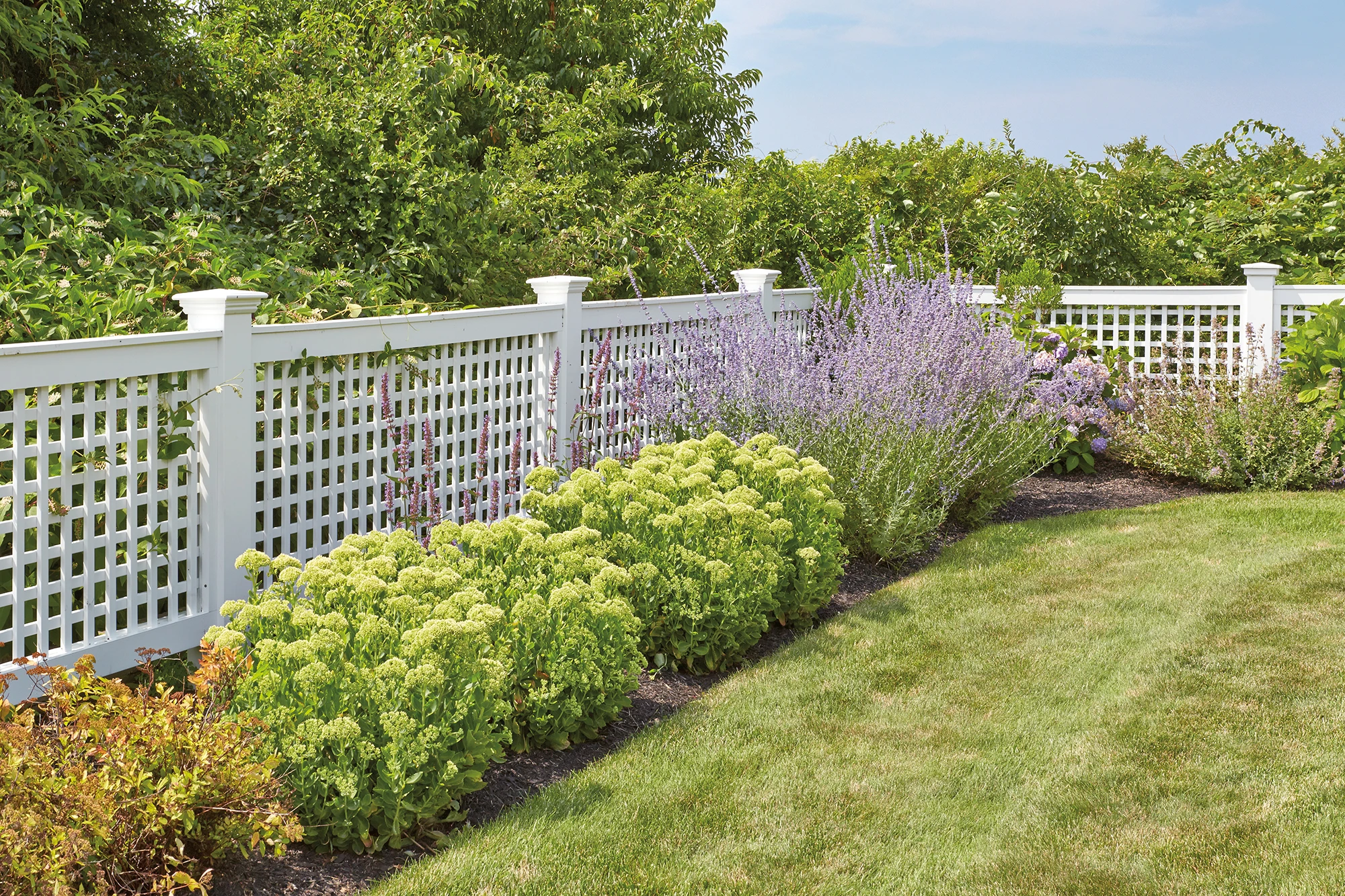 A horizontal vertical lattice fence creates a bright and airy perimeter for this home's backyard.