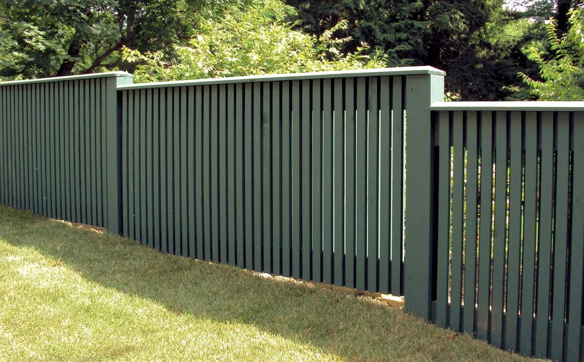 This custom vertical board fence in verde green features modified spacing and larger posts. Its unique design blends elegantly with the yard's abundant foliage.
