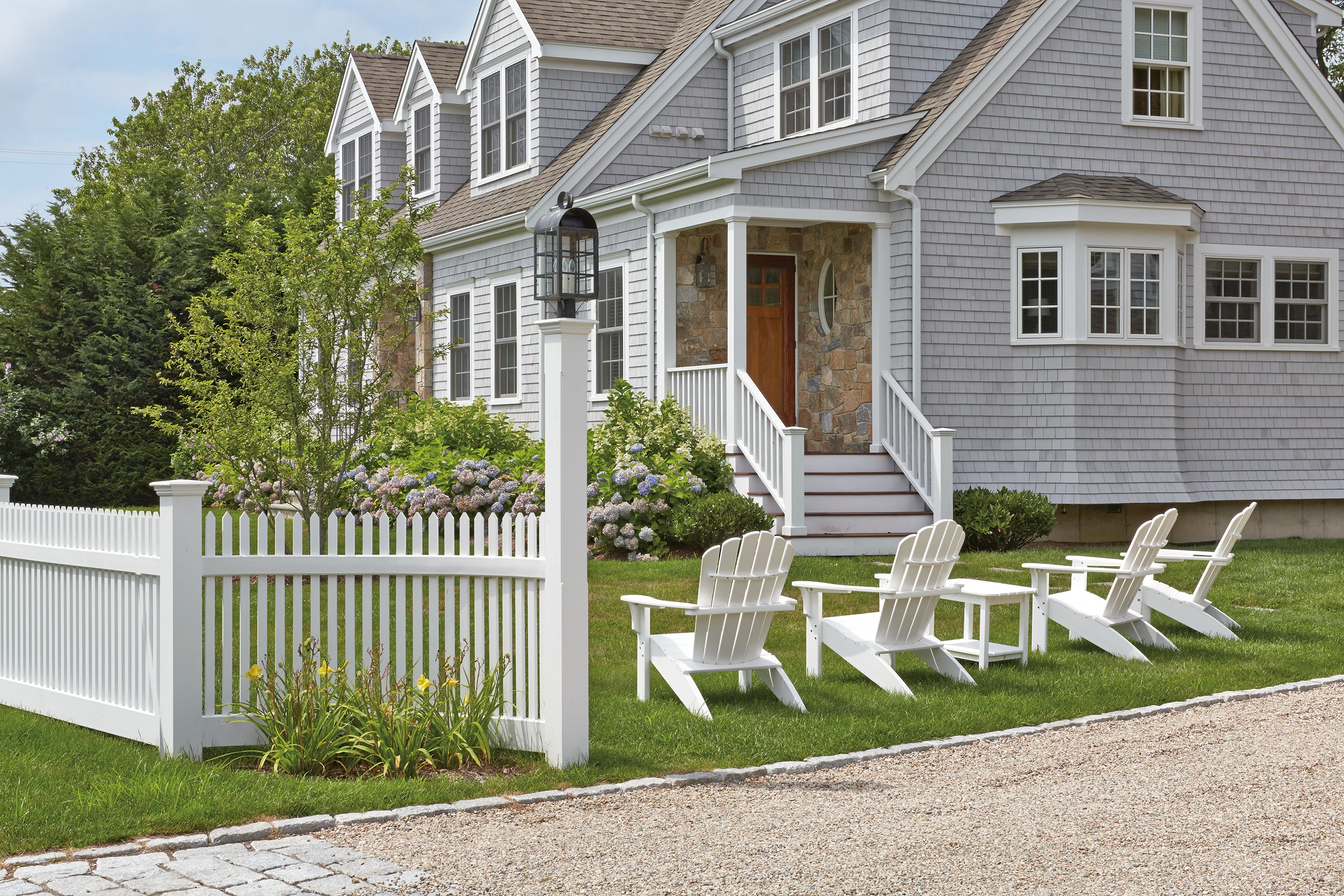 A charming Nantucket picket fence features a radius curve section with an Avon Lantern Post and Jefferson Post Mount Lantern to create this picturesque Cape Cod look.