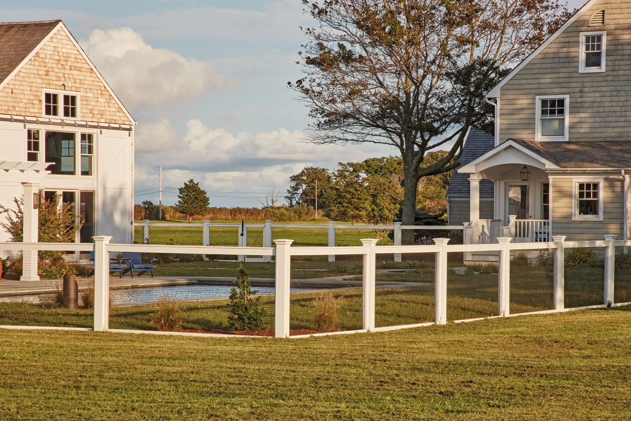 A simple yet elegant pool enclosure provides unobstructed views to the home's expansive setting with its 4' high Sag Harbor fence.