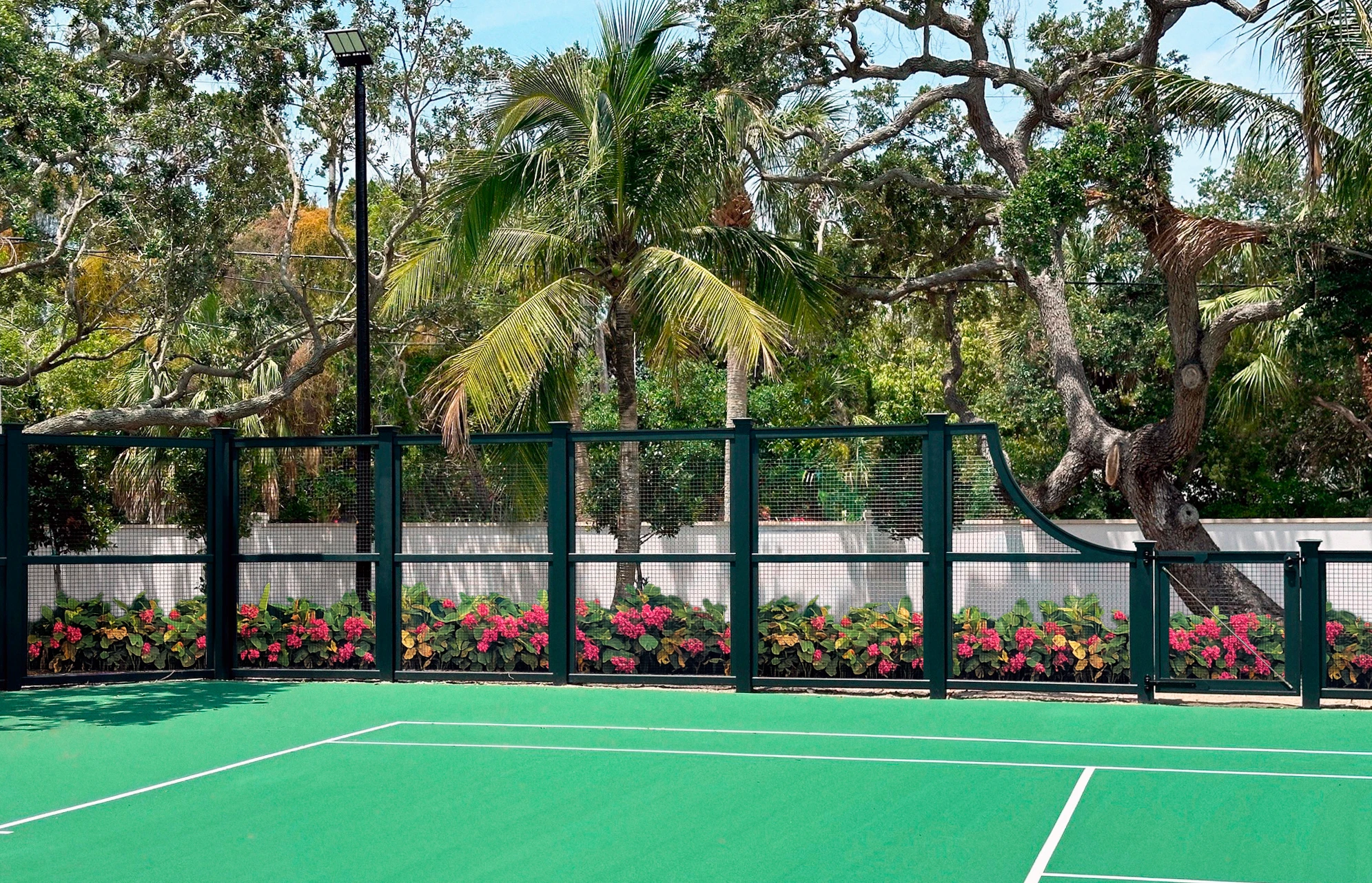 An elegant, contemporary tennis court enclosure, this Sag Harbor tennis fence was pre-finished in Verde Green to complement the property's lush landscaping. The fence transitions from its highest point with a Long End curve section into a 4'H section with a single gate. Sag Harbor tennis court enclosures include 1.5" x 12 gauge welded wire between posts.