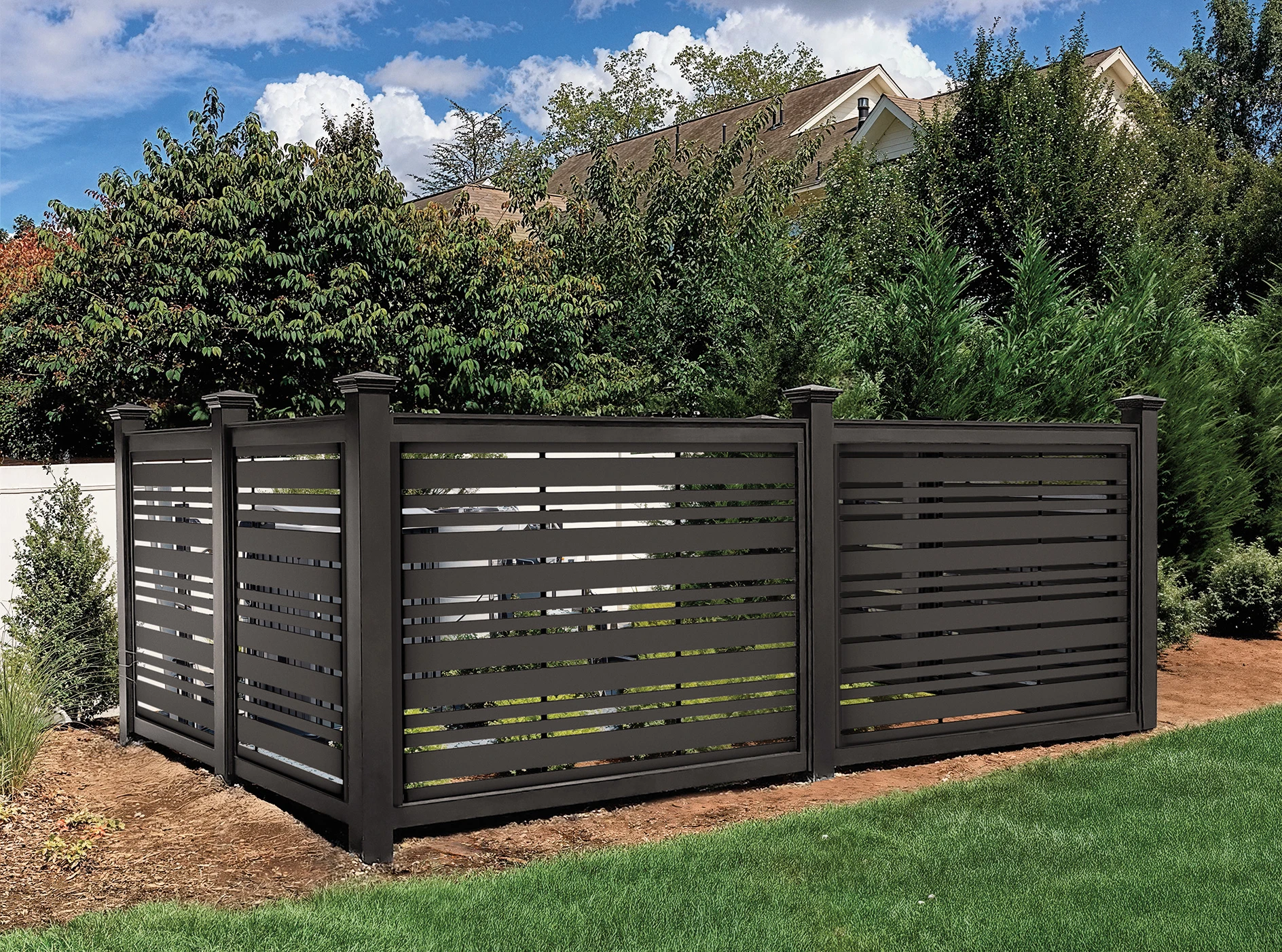 The contemporary style of this Spaced Horizontal Enclosure in Iron Ore features a unique pattern of horizontal boards to provide a sophisticated, attractive way to keep outdoor space tidy.