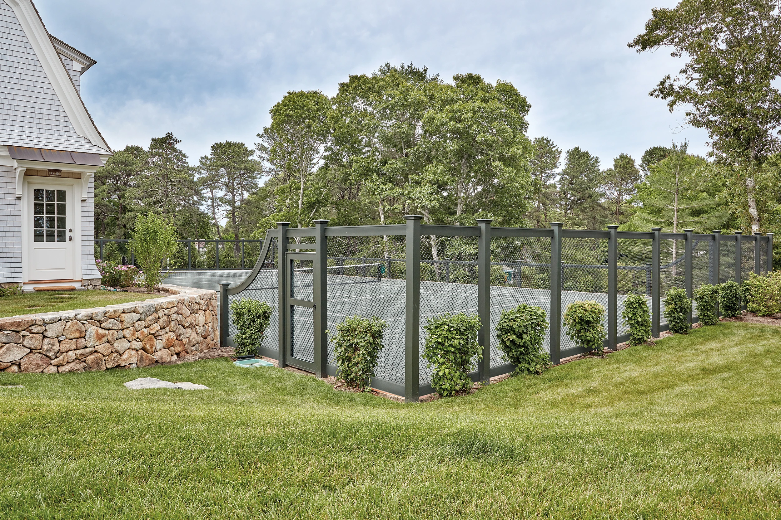 Crafted in low maintenance solid cellular vinyl and prepainted verde green, this handsome tennis court perimeter was a winning game, set, and match for a Cape Cod homeowner. Reinforced with long-wearing, rustproof Permafuse vinyl tennis court chain link, the fencing - with a court entrance gate - stands 8' at its highest sections and incorporates an internally reinforced top rail. The sideline fence with matching gate is 4 feet tall. Transitioning from the highest point are stylish curved rails. Fence posts have Walpole Westport caps.