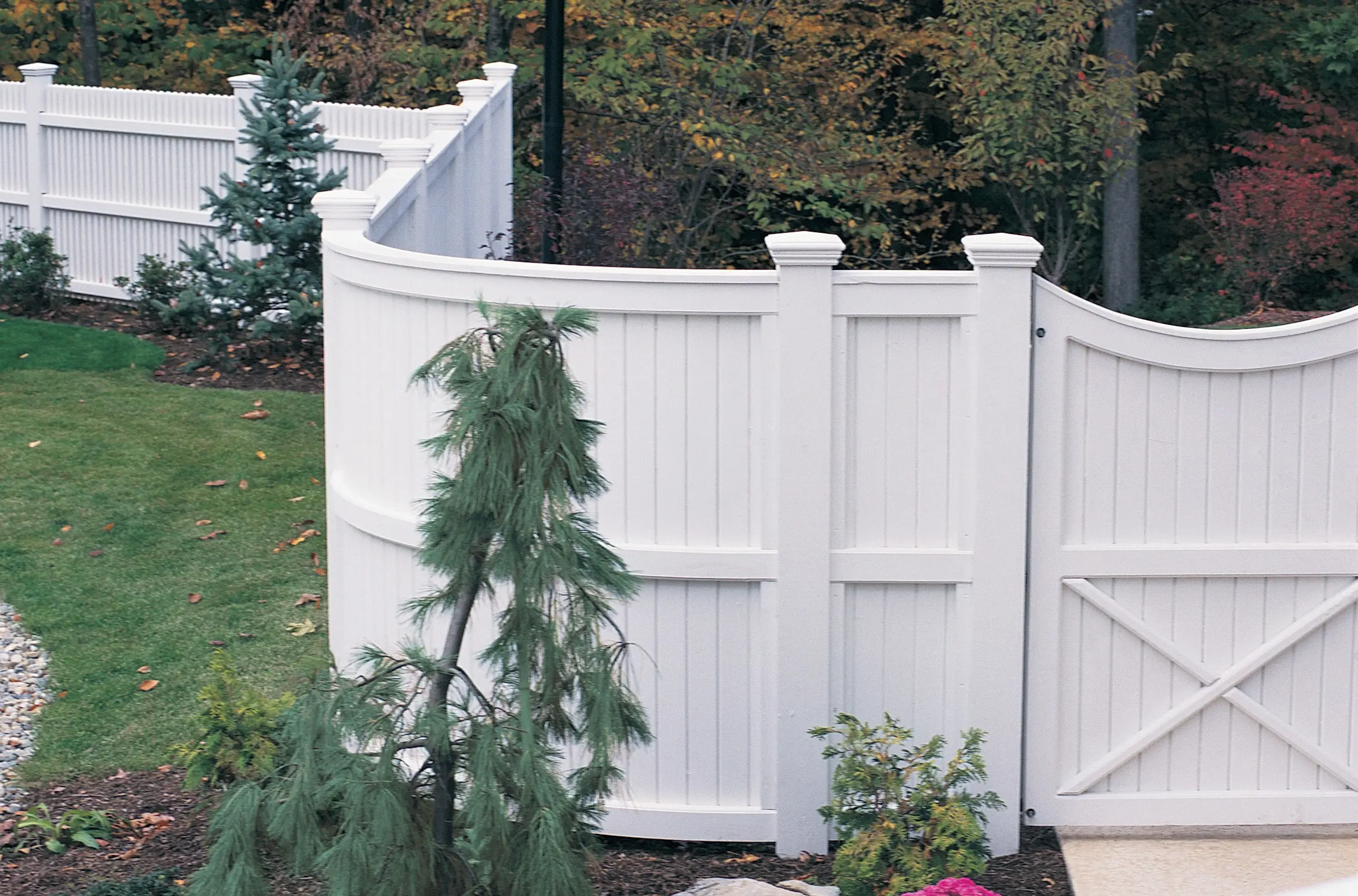 Featuring multiple boards per section for a more defined look, the Traditional board fence is solid, durable, and for privacy, extremely effective. A handcrafted radius section is shown here. In the background is our Chestnut Hill picket fence.