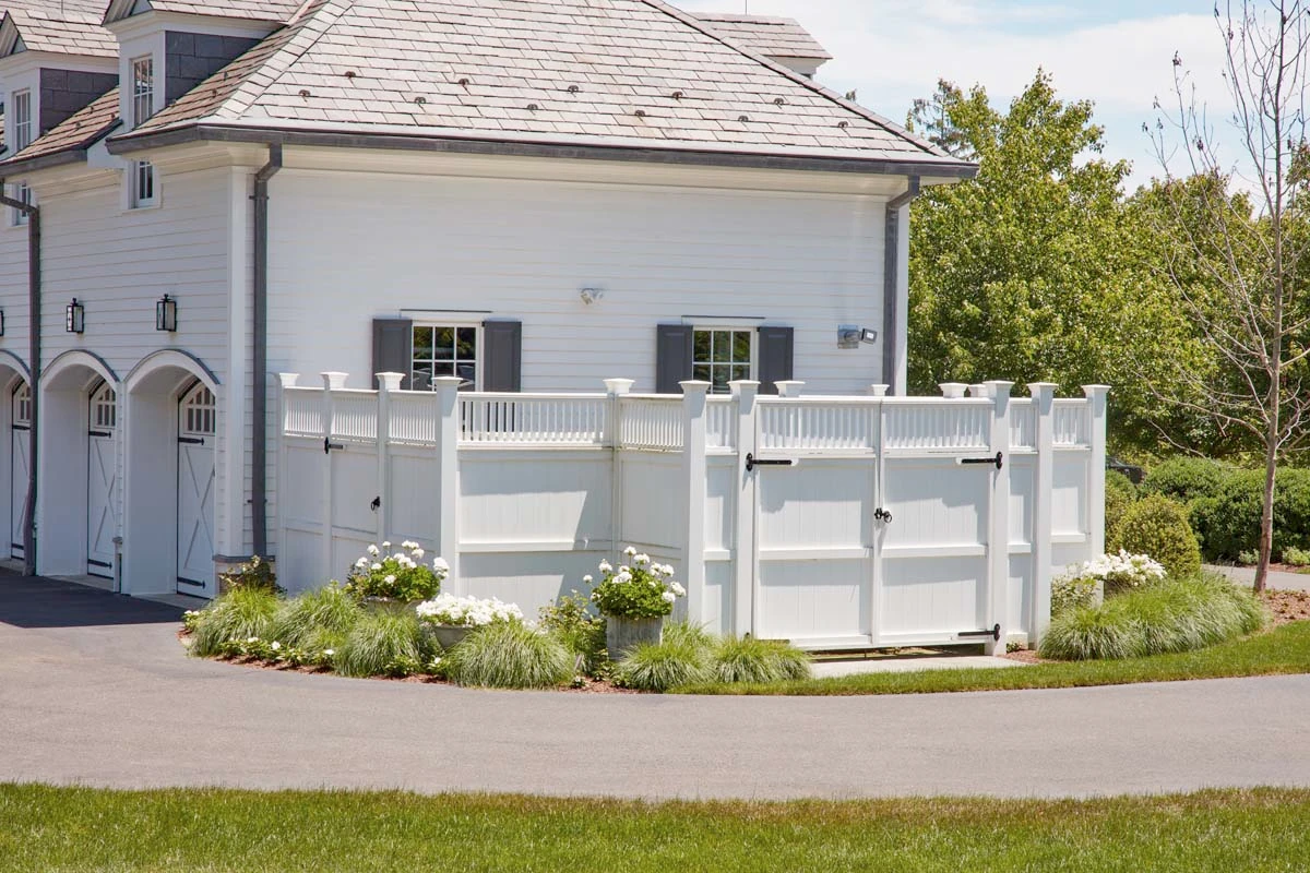Tucked inconspicuously behind a classic Walpole Universal fence are the home's generator and the property owner's large smoker cooker. Adding charm to the fence is an 18" high Yorktown Topper. The gates are 84" high and stand 8 feet wide. The side gate, also 84" high, is 4 feet wide. Posts are 5.5 " square with Westport caps. Fence and gates are crafted in solid cellular vinyl and factory coated with Sherwin-Williams VinylSafe paint. The gates have black powder coated Devonshire hardware with twisted ring latches.