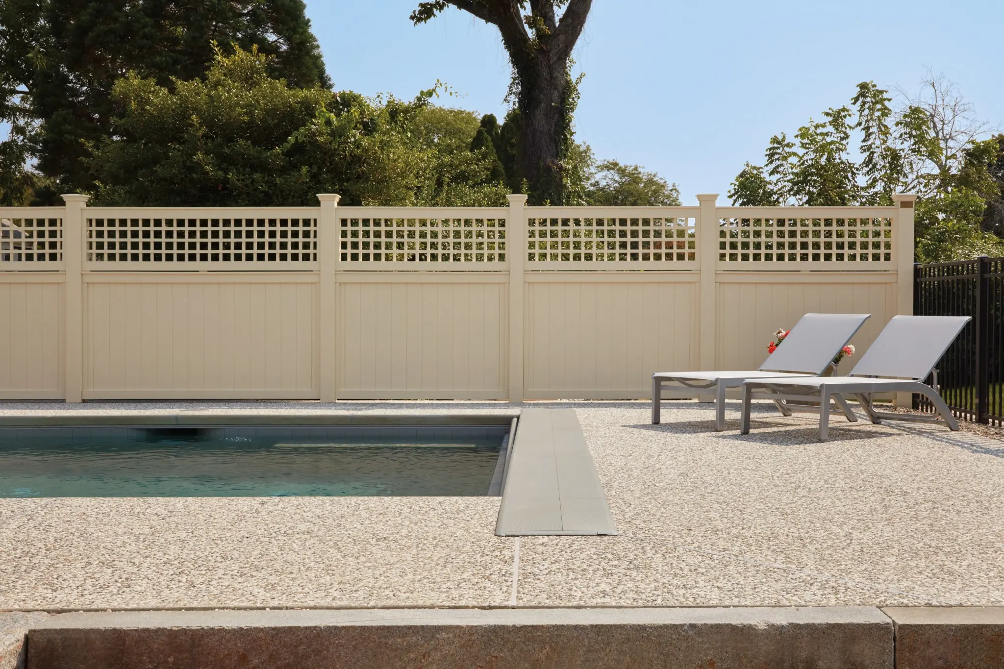 Privacy and safety around a pool area are provided by this 5' high Universal board fence crafted in low maintenance solid cellular vinyl. It has a 2' high horizontal/vertical topper with 3.25" openings, giving it a light airy presentation. This pool fence posts have steel cores and Westport post caps. Factory finished in a Sherwin-Williams custom color.