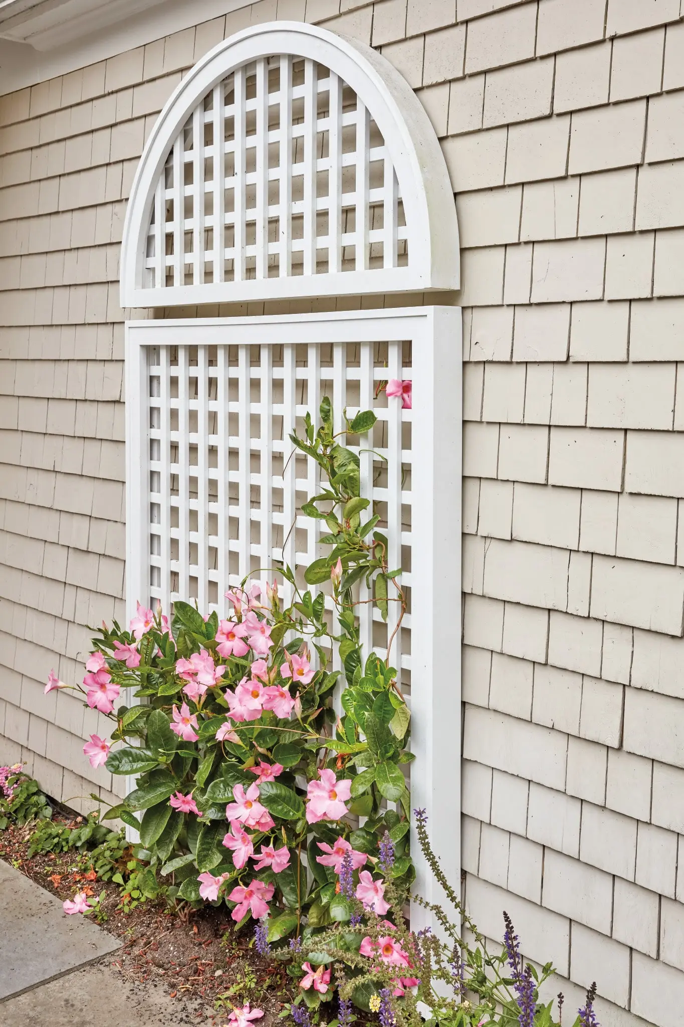 Crafted by Walpole in solid cellular vinyl, lattice panels provide an opportunity to encourage climbing plants or to present an imaginative design on any of your home's exterior walls. Pictured here is a six foot high rectangular panel, with 2.5 " square horizontal/vertical lattice openings paired with a custom radius.