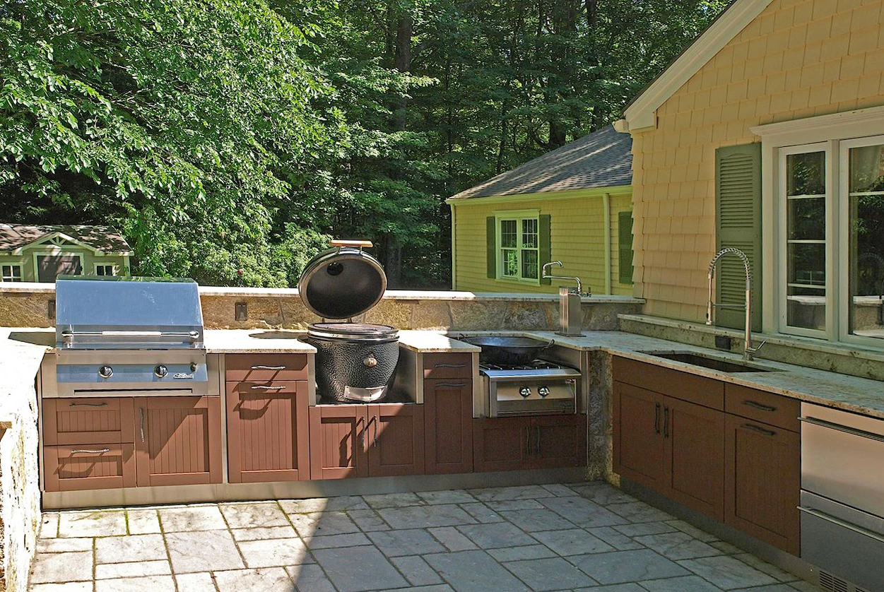 Special order colors that match your personal style are also available, like this powder coat finish with Bead Board doors from Brown Jordan Outdoor Kitchens. Pictured - Bead Board door style (Brown Jordan Kitchen exclusive) in custom color. Appliances left to right: Solaire 30" all-infrared grill, Saffire Ceramic Egg.