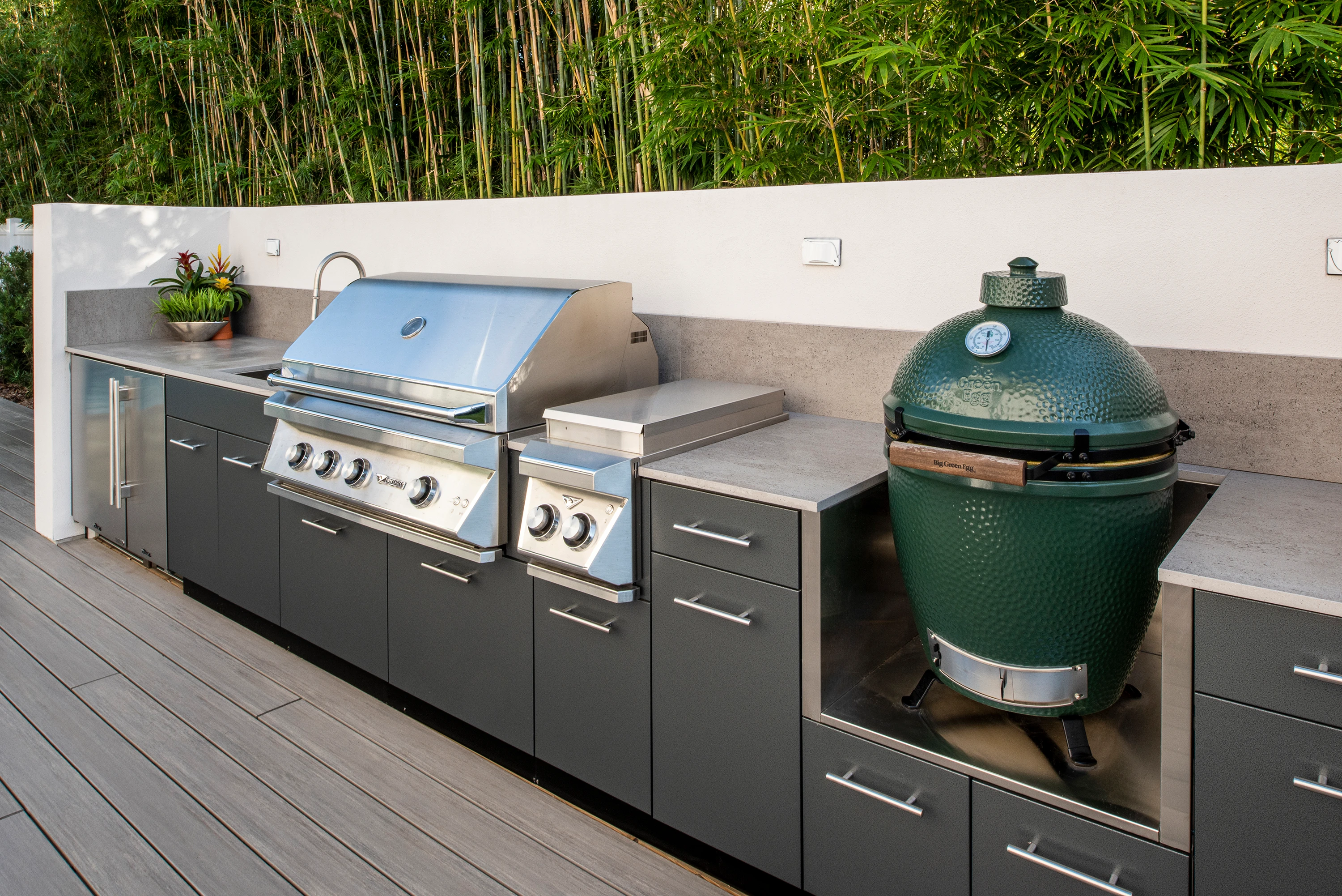 The first to bring color, style, and design to outdoor kitchens, Danver offers endless possibilities with stainless steel cabinetry - along with your choice in top-of-the-line appliances including refrigerators, pizza ovens, barbecue grills, smokers, and more. Featured here is a contemporary solid slab Hampton door style with the sleek looking Nu-Black Hammertone kitchen cabinet door powder coat finish. Powder coating stainless steel is the best way to create all-weather cabinets in your outdoor kitchen. Here, the Nu-Black finish matches superbly with a sink, Twin Eagles grill, and a Big Green Egg charcoal barbeque cooker.