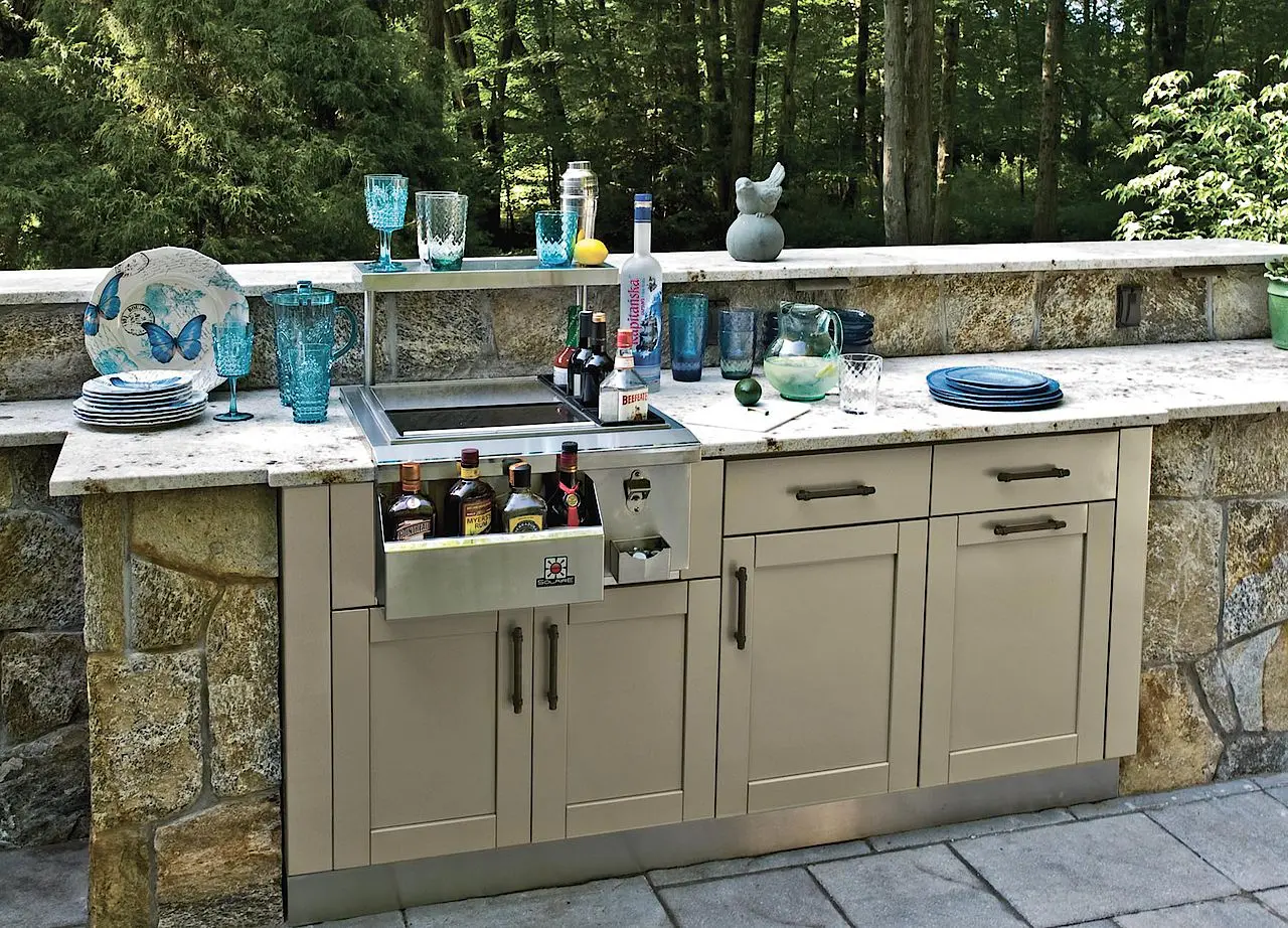 Cocktail parties and evening festivities leave lasting memories for you and your guests when incorporating the proper appliances into your outdoor kitchen. Key West doors with a powder coat finish in Champagne 302 from Danver. Pictured - Key West door style in Champagne #302 color. Appliances left to right: Solaire 24" Bartending Station.