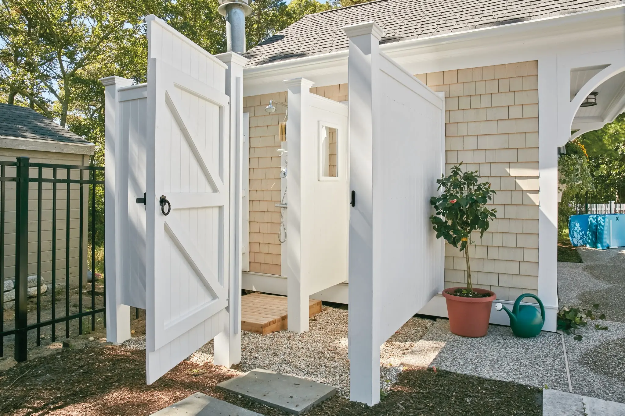 Crafted in low maintenance solid cellular vinyl, this custom Chatham is an ultra-roomy enclosure with a door and separate shower and changing areas. The homeowner has chosen an optional mirror frame, cabinet, towel rack, and cedar decking for added underfoot comfort. It is Walpole factory prefinished in a Sherwin-Williams VinylSafe white paint with a 25-year warranty. The Chatham also comes in a standard kit, 96" wide by 74.25" deep in solid cellular vinyl, as well as 93" by 73.5 " in natural cedar.