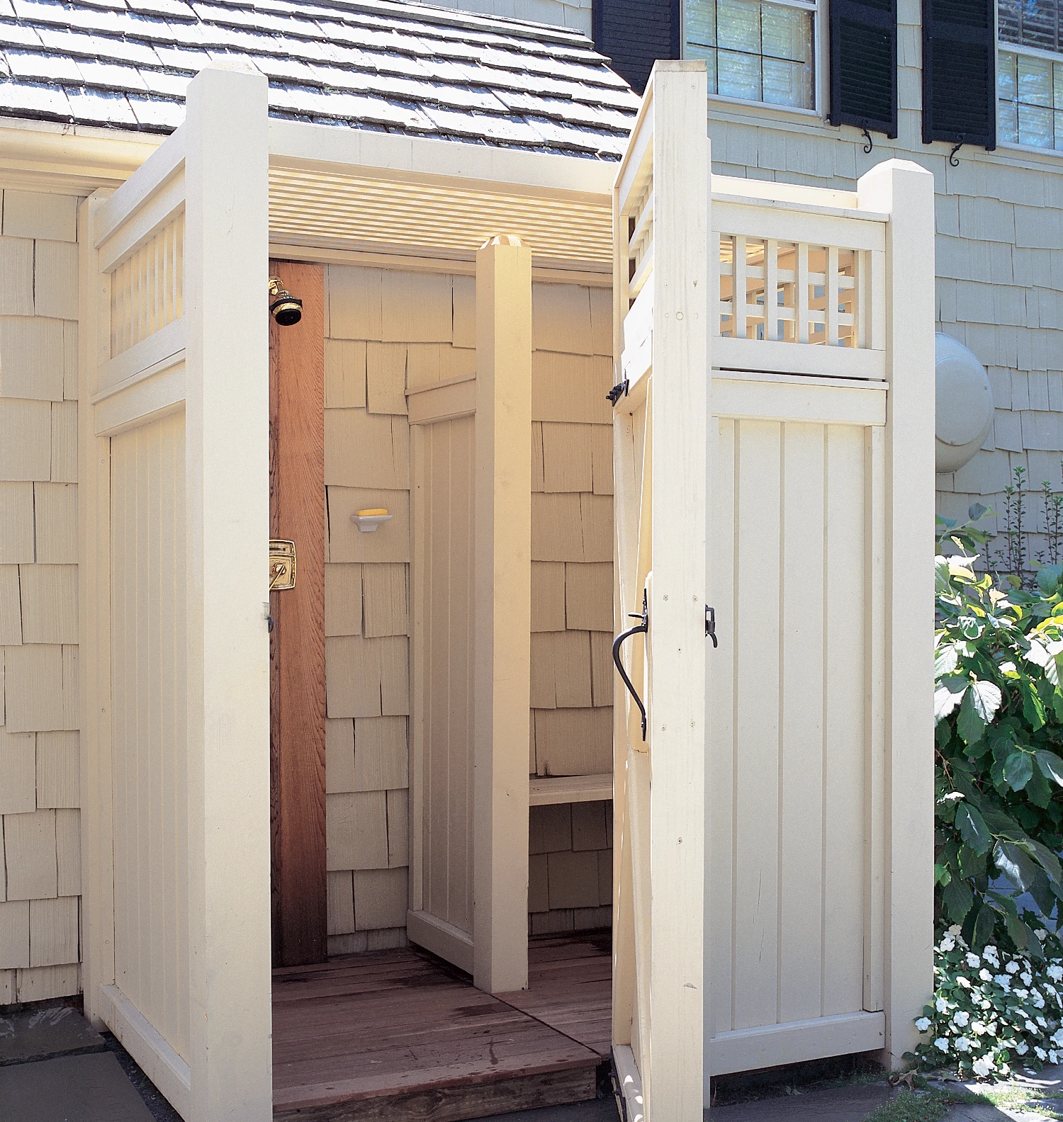 Here's a refreshing idea for summer. Have fun creating a shower enclosure customized to match your home or pool house architecture. Consider construction in cellular vinyl or cedar; options such as lattice panels, ceilings, post caps, choices in hinges, and much more.