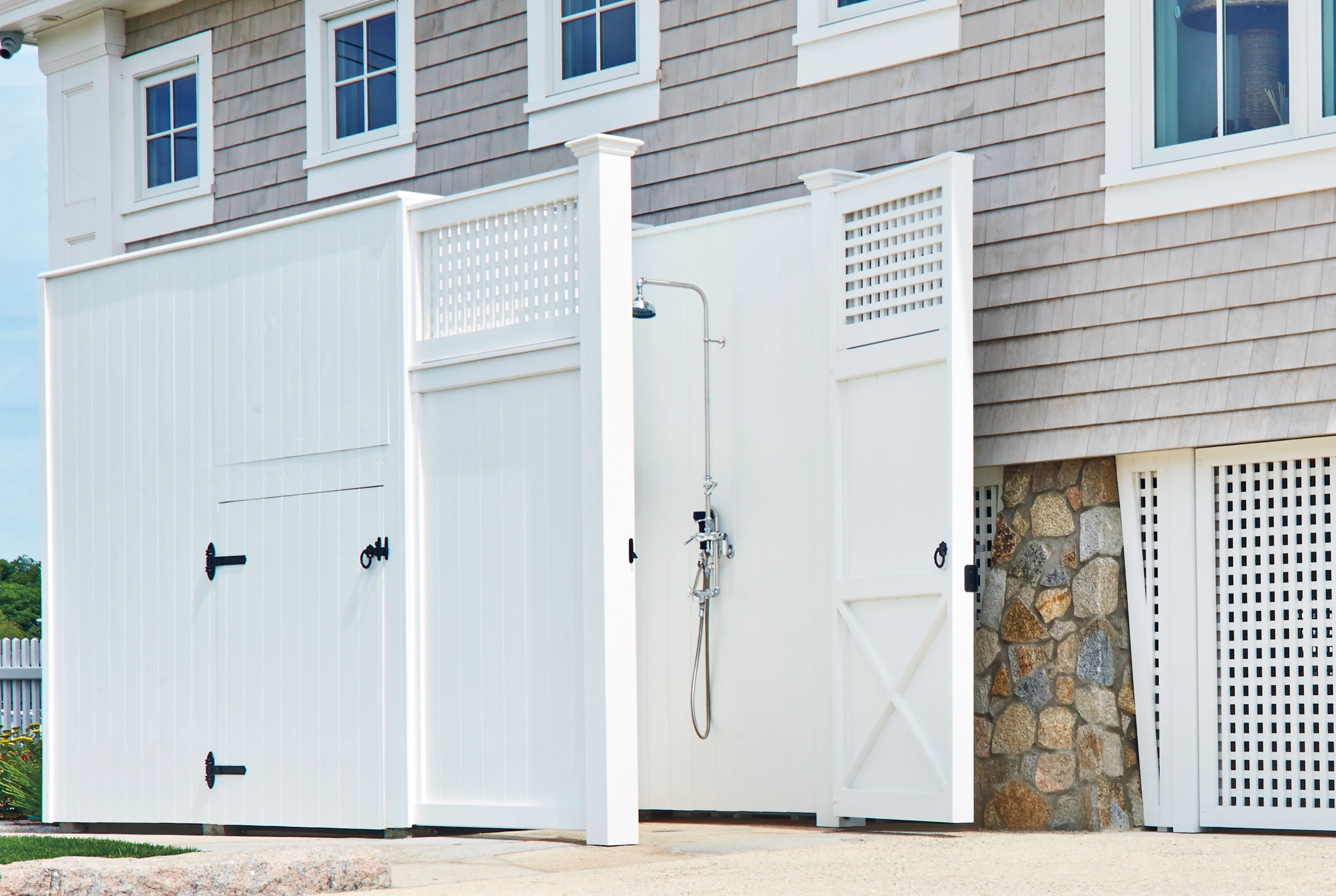 This tall custom enclosure provides an outdoor shower, and it also surrounds AC units that have been raised above the high water mark. Lattice skirts add an airy, classic look.
