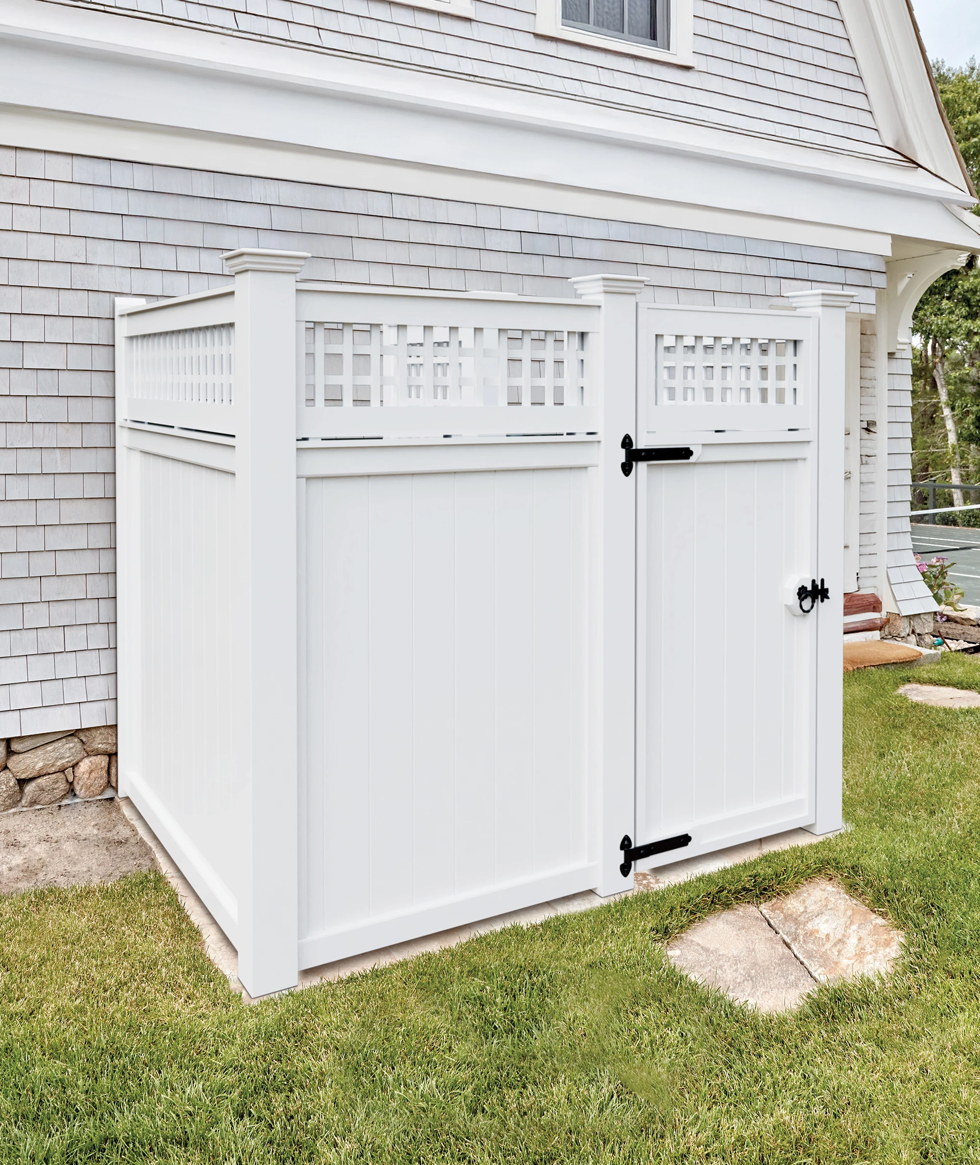 Designed for both function and style, this Board & Topper shower enclosure offers a private retreat for rinsing off after a swim, enjoying a refreshing outdoor rinse, or adding a charming coastal element to your landscape. 2.5"HV Lattice tops a Universal board.