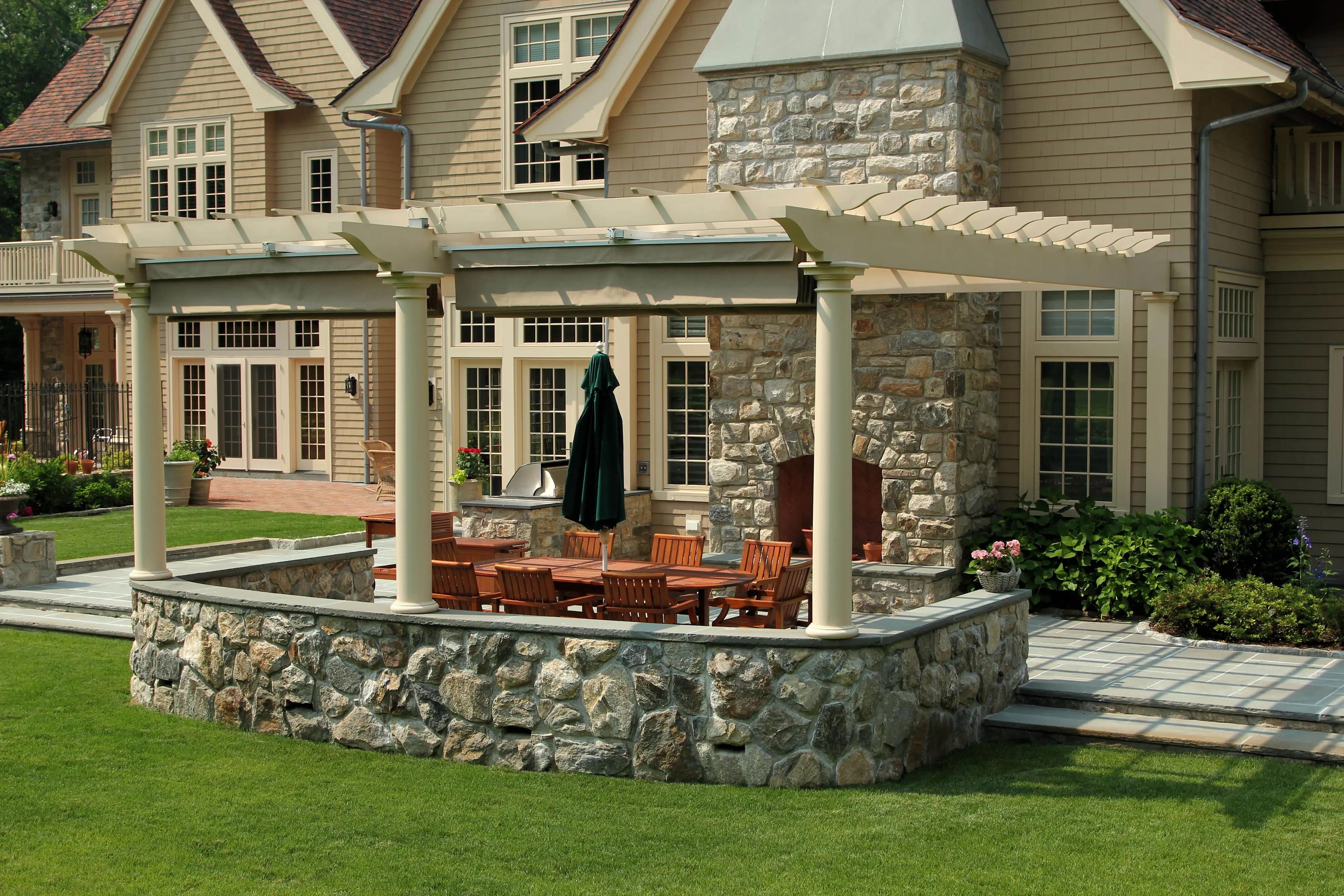 A grand outdoor room takes shape around this stone fireplace with an attached pergola constructed on the home's patio. A custom paint color was used to match the home's trim for a cohesive look.