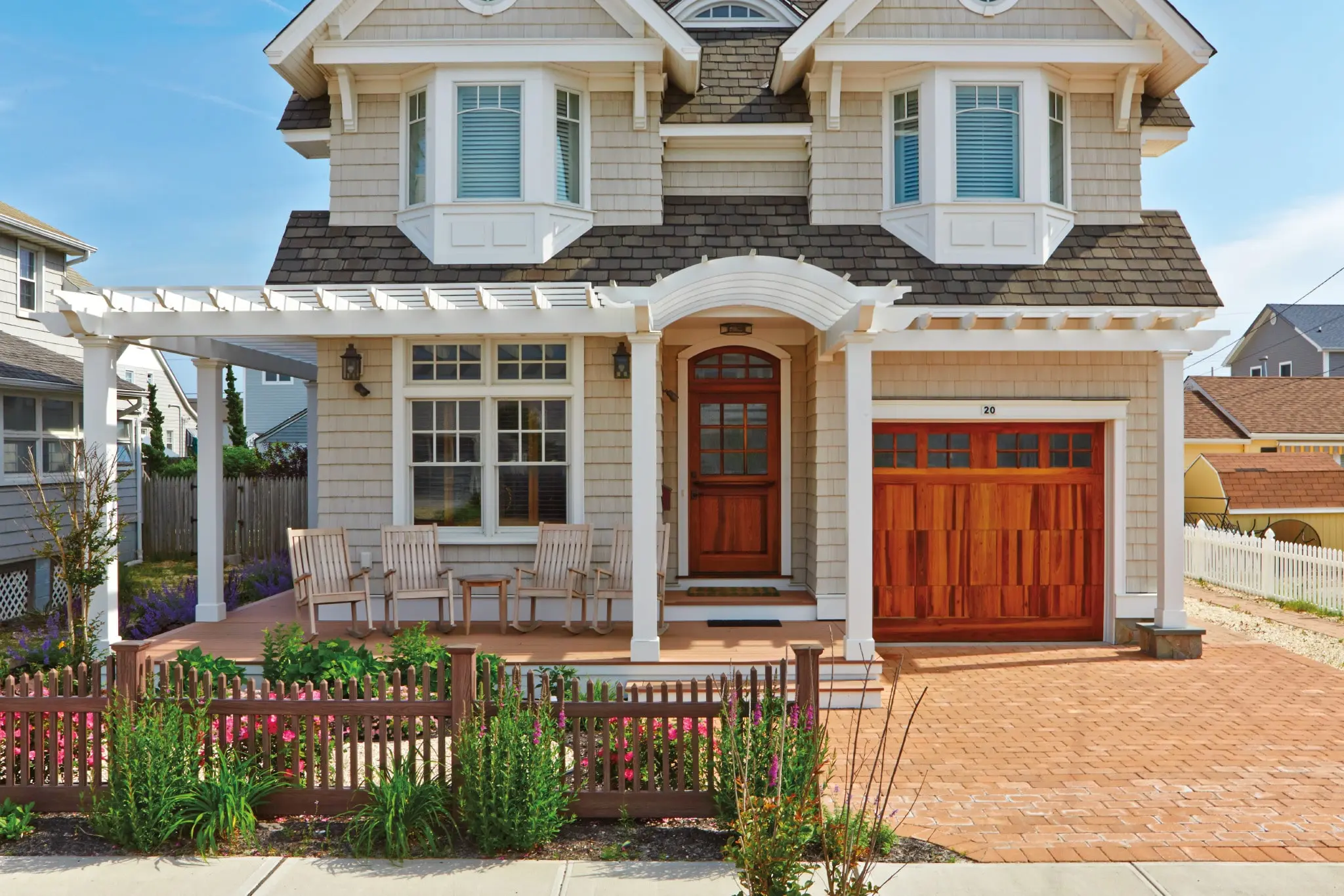 A custom attached pergola with square columns adds a distinctive, stylish presence to the entrance of this new construction home.