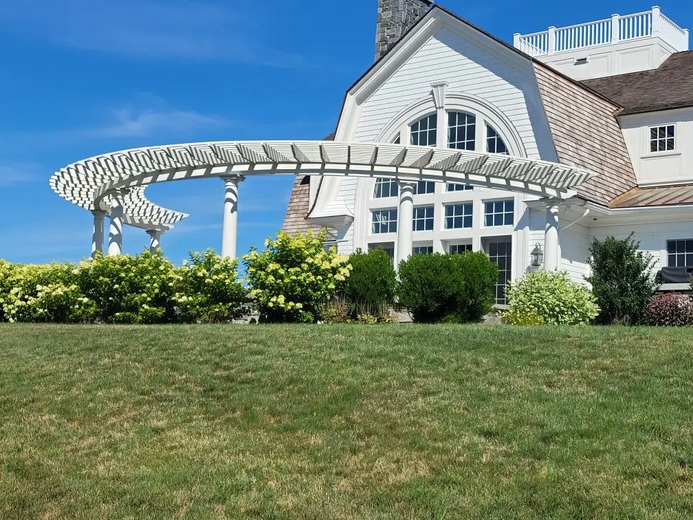 Designed as an architectural feature for the backyard space, this custom radius pergola with round columns creates a beautiful and elegant perimeter for the home's patio.