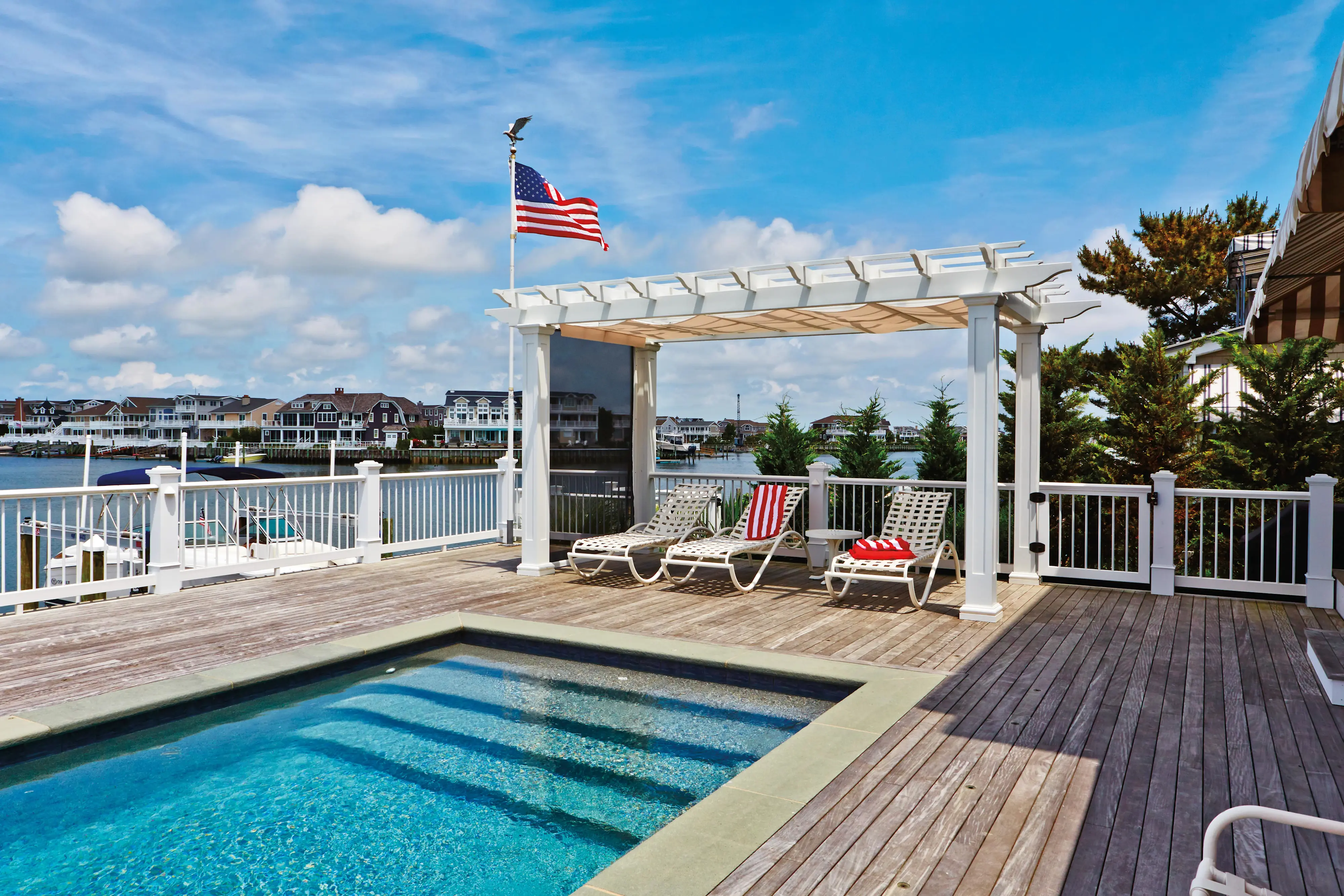 Guests feel right at home by the water and at the pool under our standard kit pergola. It features a straight top with shade panels and square column supports.