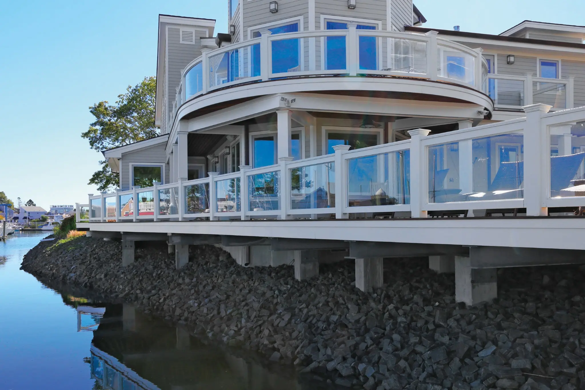 Whether displayed on a straight rail expanse or on a curved porch seen here on the upper deck, a custom glass railing provides the clear advantage of an unobstructed view.