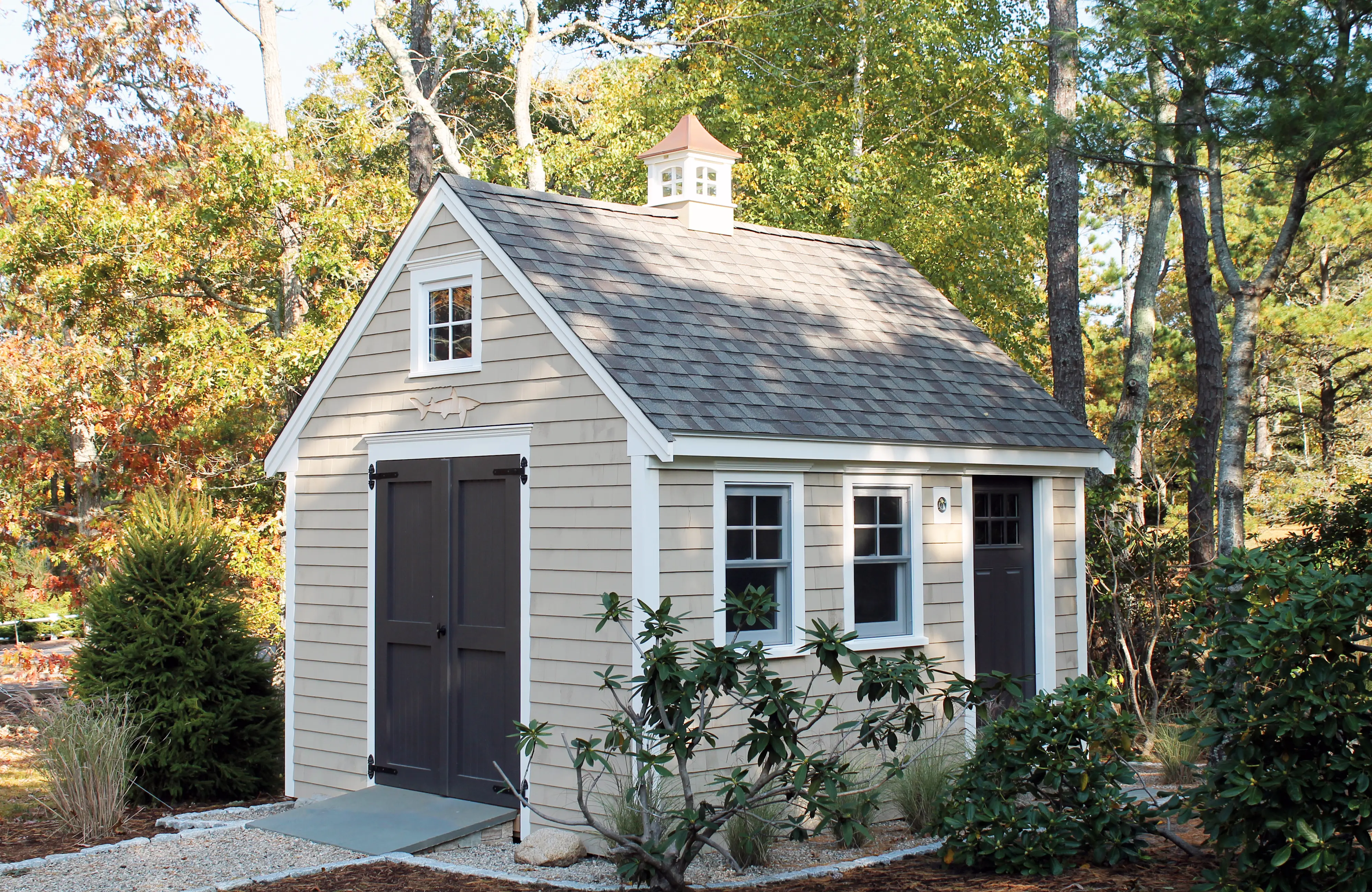 This charming and highly functional New England style Pine Harbor building offers ample storage space, reducing yard clutter. It is graced by a cupola, has board and batten siding, convenient double doors on the side, and a front door. Architectural roof shingles are standard. Walpole offers many small building styles to suit your needs and space, with an array of exterior and interior options. Sized from 4' by 6' to 14' by 24', custom built on your property or DIY.