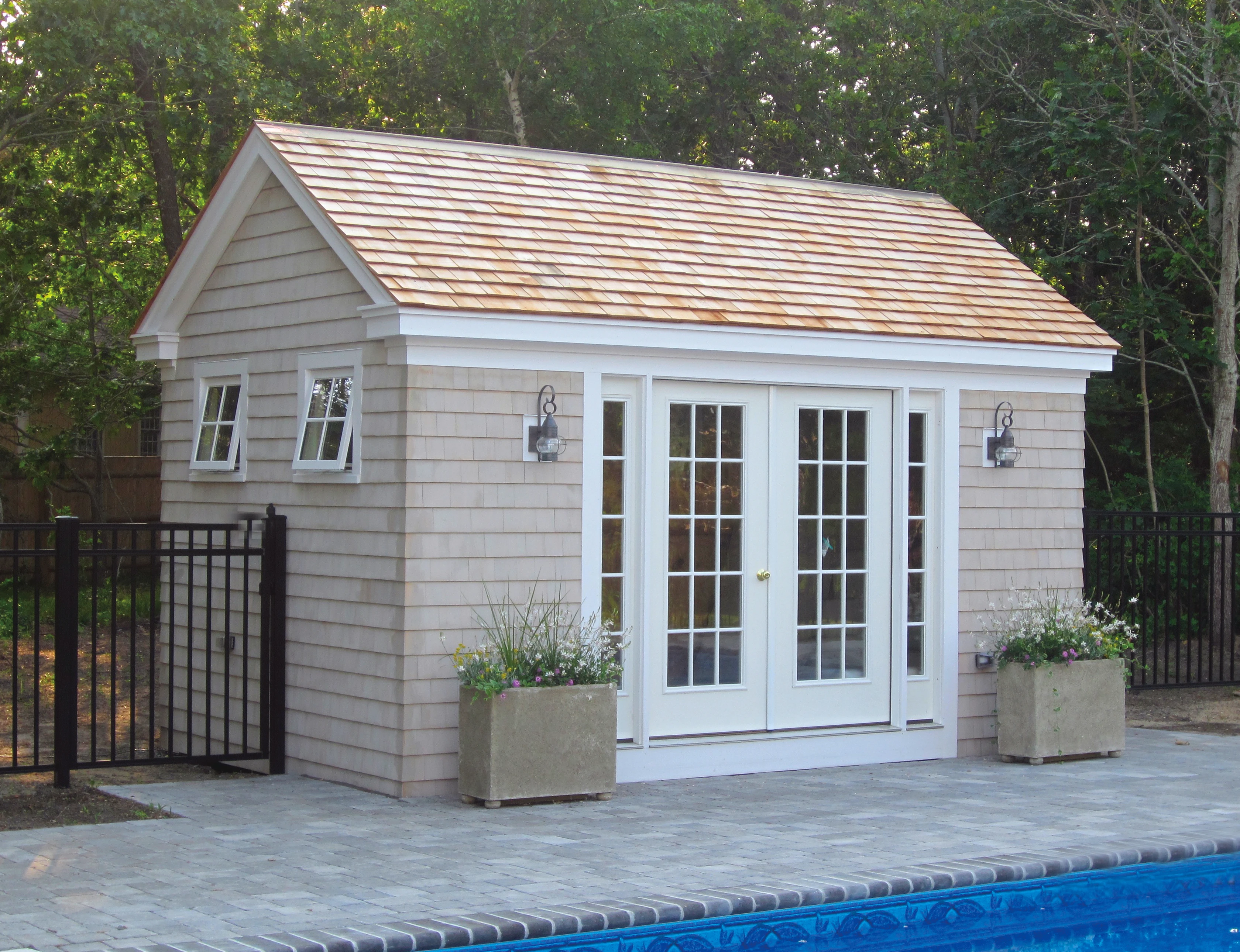 The custom 10'x16' pool house featuring 6' fiberglass French doors with 12" fixed side lites creates a stylish room by the pool. The building is shown with a 8/12 roof pitch, 24"x24" PVC awning windows, historic sills and lite blocks along with a red cedar roof with a copper cap. Pre-dipped white cedar shingles with woven corners and PVC estate style trim make this an impressive addition to the pool area.