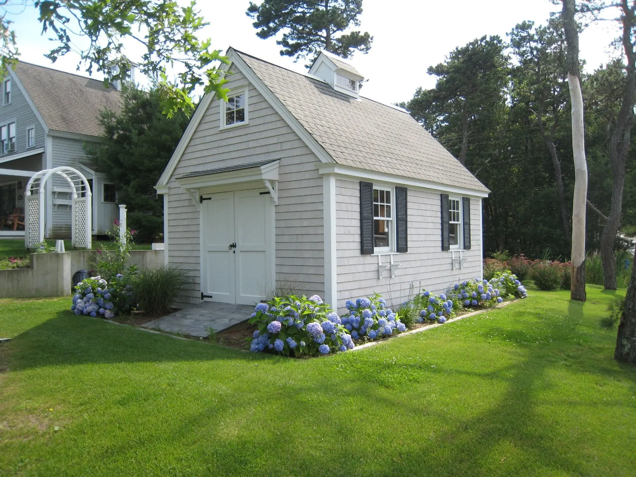 This signature Cape Codder building is a gardener's dream. Standard 24" x 44" double hung windows and cottage trim are shown. Customizations include additional 4-lite sash window (instead of vent), double 2-panel door (standard single 3' door), and an added cupola.