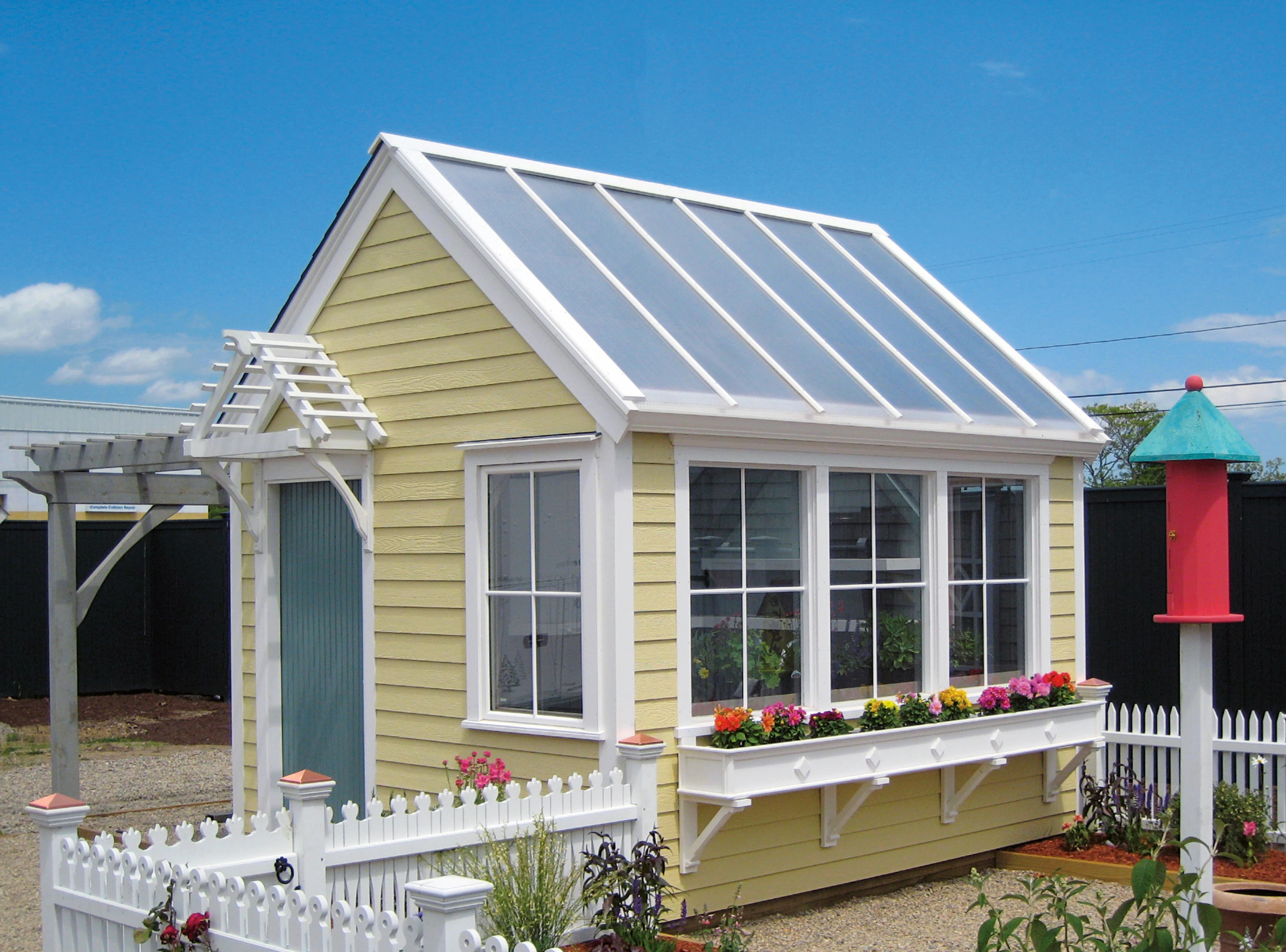 A Pine Harbor potting shed will be the centerpiece of your garden. Durable polycarbonate roof panels and spectacular windows allow the sun and heat to radiate over your work space or potting bench.