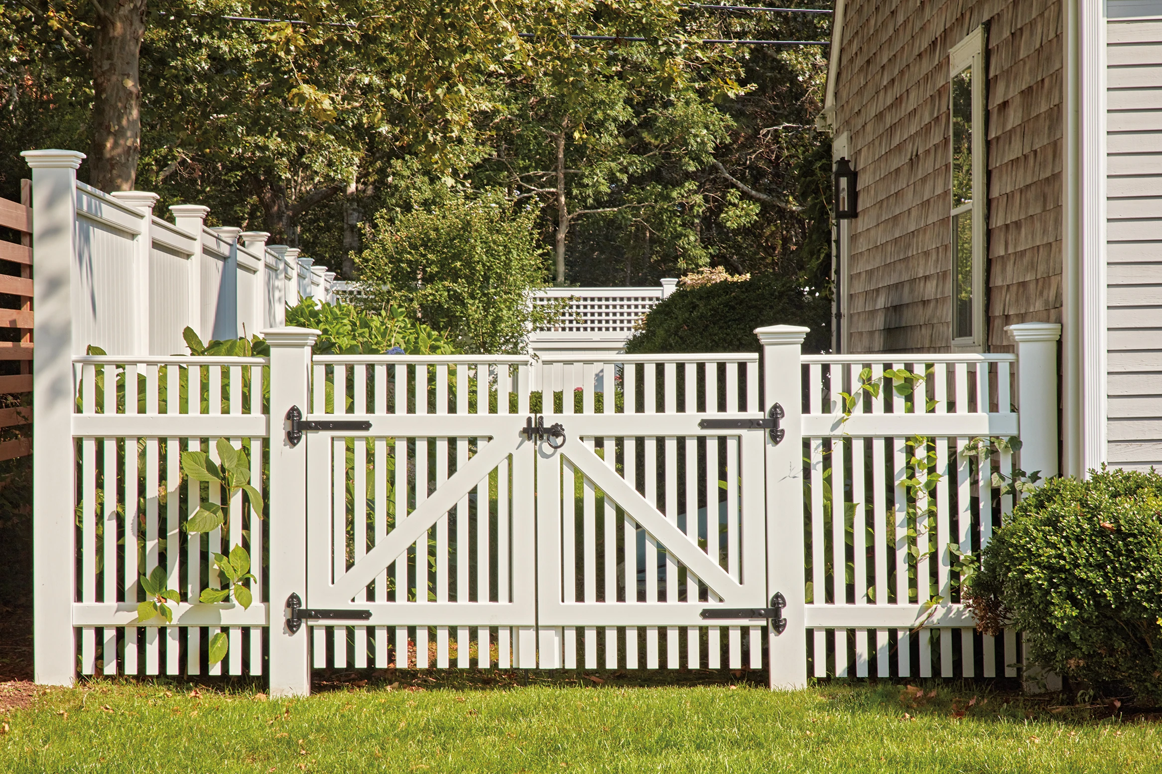 This customized Nantucket Picket Double Gate adds a strikingly elegant entrance to the yard, thanks to the addition of a refined cap detail over the scalloped pickets. The result is a polished, architectural touch that enhances the traditional charm of the classic Nantucket style.