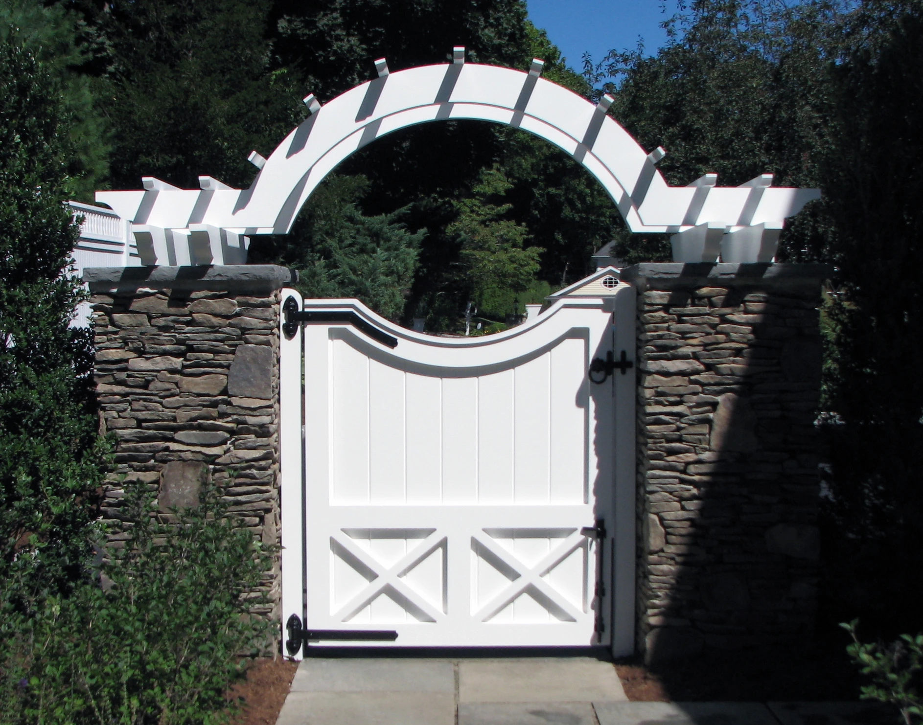 Custom Board Gate and Arbor in Stone Posts
