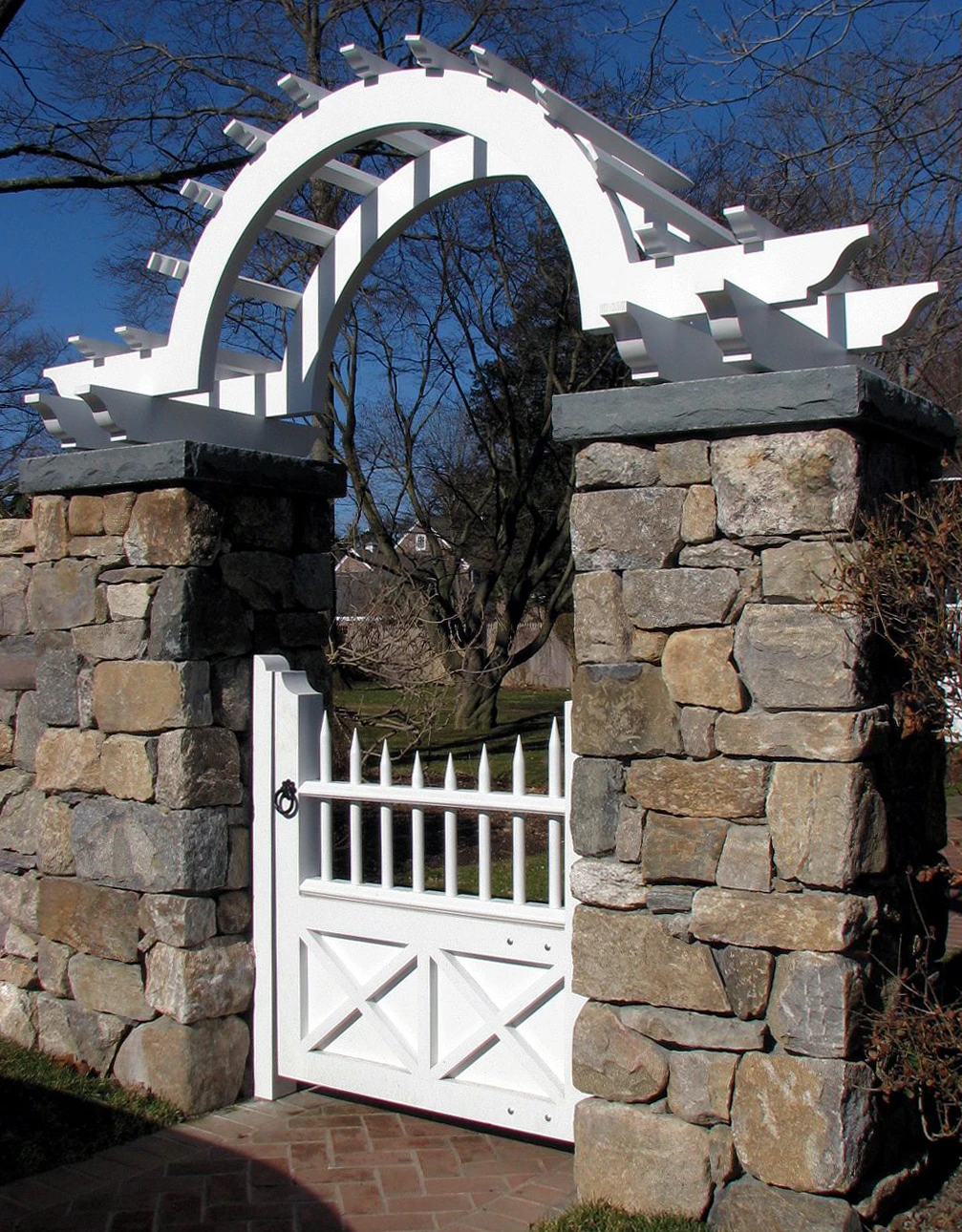 Custom Gate and Arbor in Stone Posts