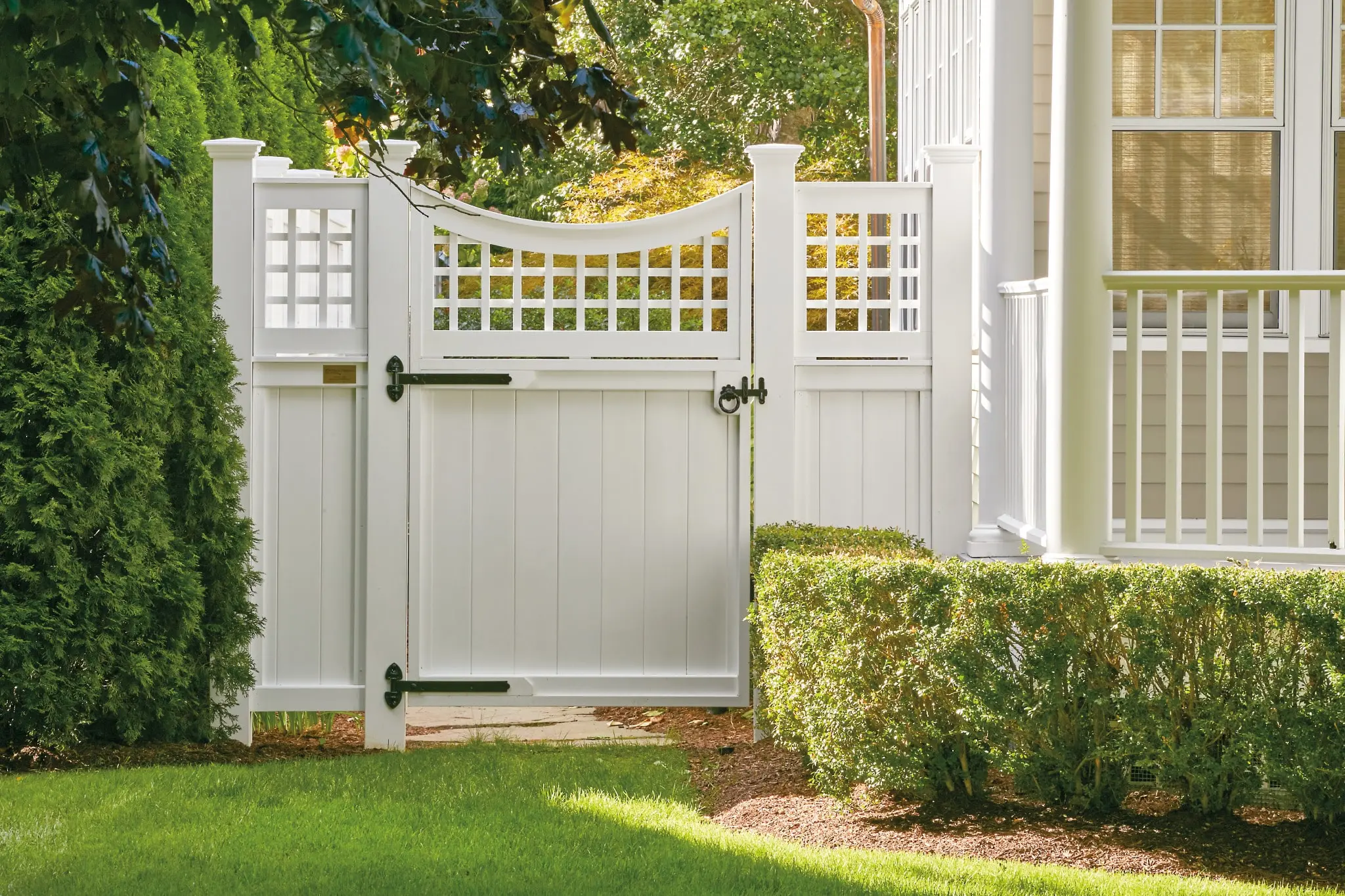 A handsome gate is an opportunity to indulge your preference for classic or contemporary styling. This perennial favorite is our dignified Universal board gate. The 4' wide gate shown here has a pleasing concave lattice topper that subtly offsets the straight lines of the 2' topper on the attached Universal fence.