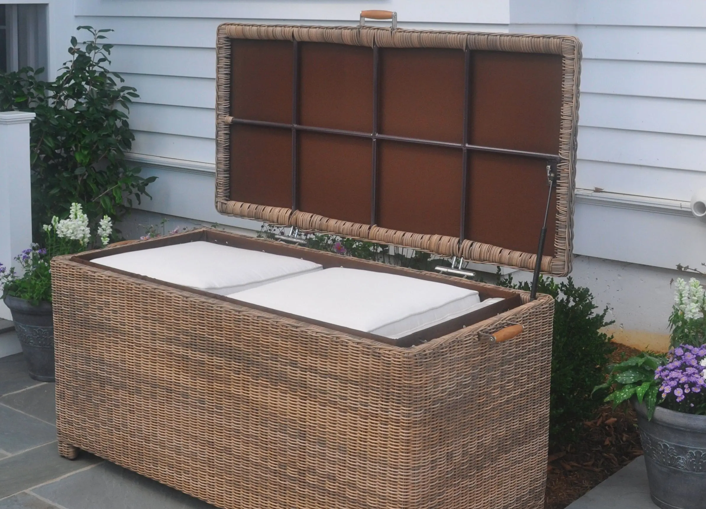 Powder-coated aluminum frame, a hydraulic arm prevents lid from slamming, with teak handles. Removable, water-resistant lining has holes for drainage. 32.5"H, 67"W, 32"D....