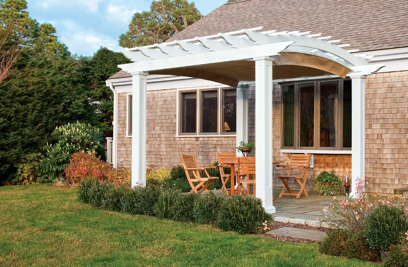 Sizes are measured on-center of the posts and have a 1.5' overhang. Square Solid Cellular Vinyl columns with recessed panels, capitals and decorative base. Factory primed and painted. Arrives ready to install. Expected to ship within 6-8 weeks. Manually operated or motorized shades are offered in over fifty Sunbrella rain-resistant, waterproof and commercial fabrics. Shade canopy sold separately.