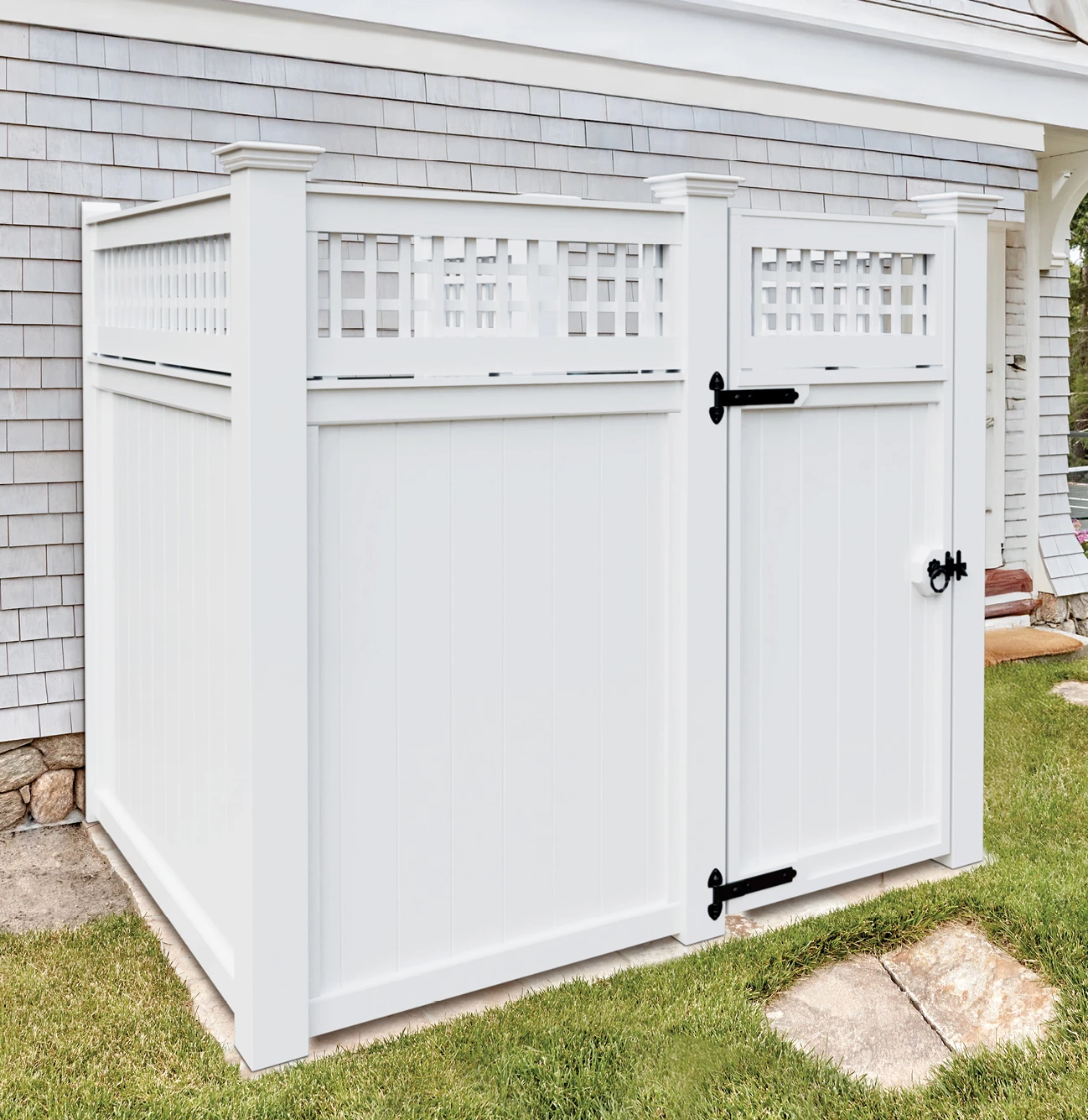 Solid Cellular Vinyl is an advanced, low-maintenance vinyl material impervious to water and won't warp, rot or split. Solid Cellular Vinyl enclosures come standard with 5.5" square posts with Westport post caps and a white, factory prefinish. Hardware includes black powder coated, galvanized heavy reversible strap hinges and ring latch.