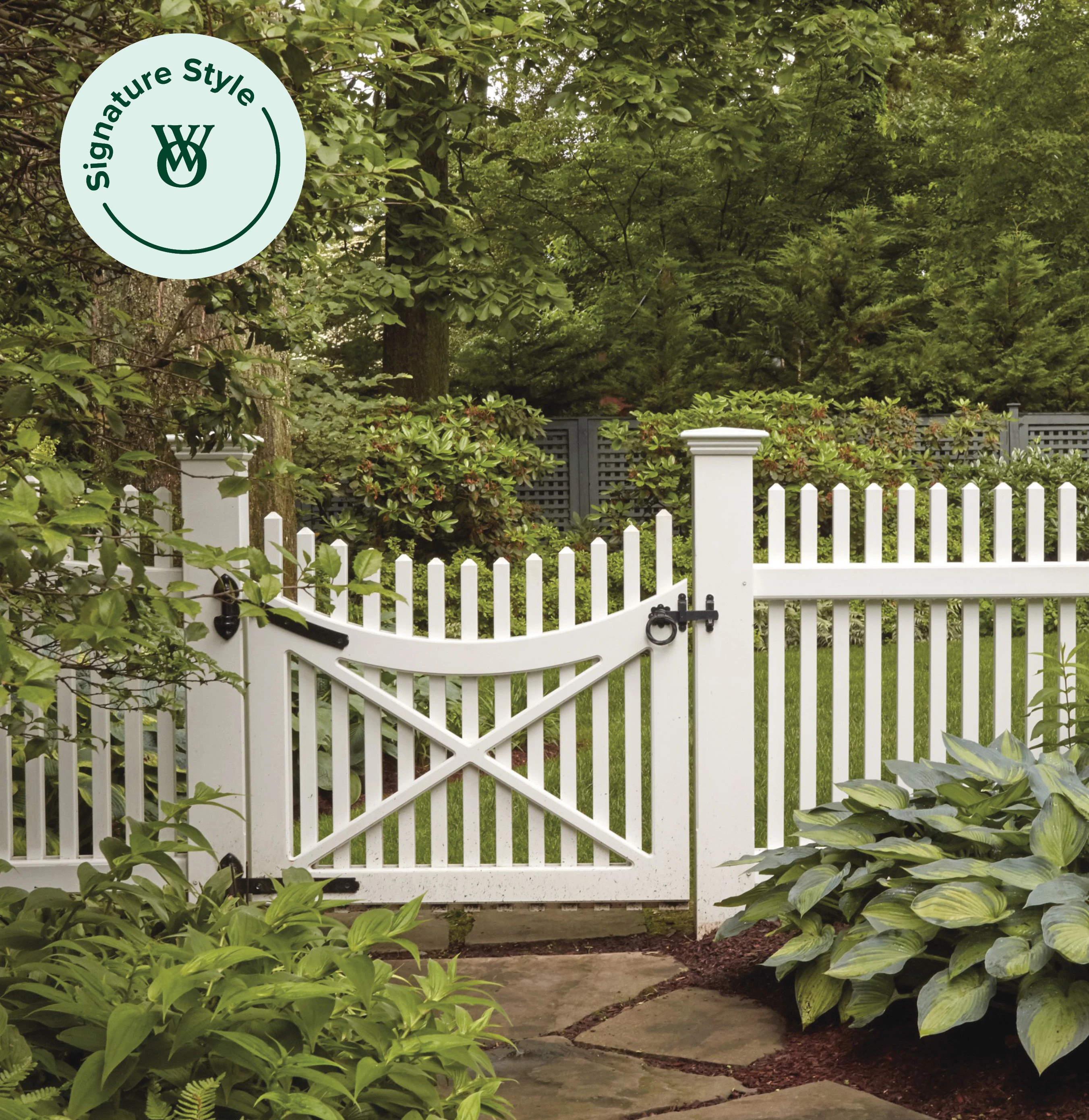 This solid classic fence beautifully combines practicality with charm and grace. Mortise and Tenon installation. 1½'' square pointed pickets. 5½'' square posts. Available 3'H to 6'H. Sylvera offered with straight top only.
