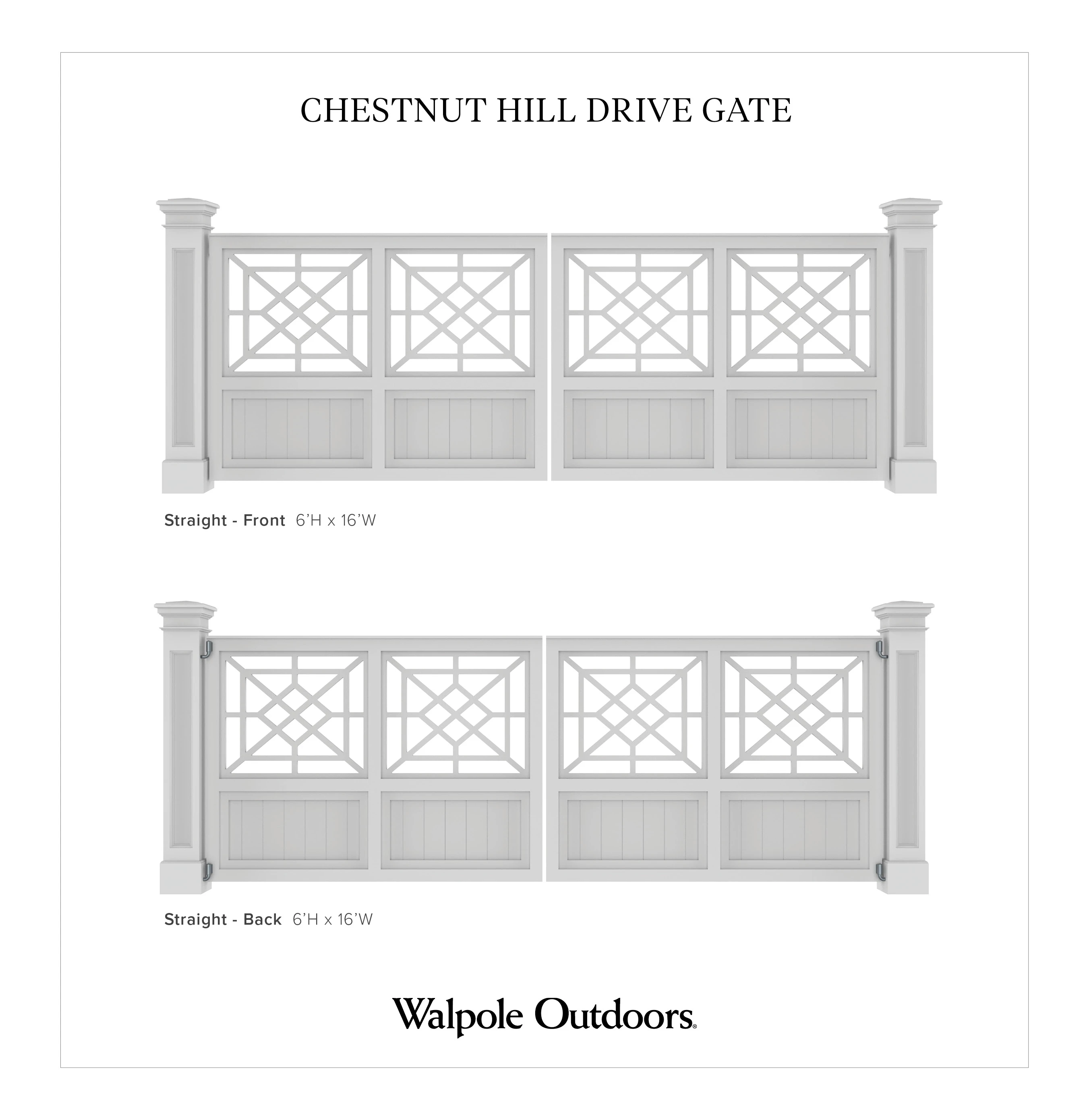 This distinctive entrance gate adds architectural interest with a unique pattern. Available with straight, arched, or scalloped tops; Wenham, Darien, Bostonian pillars or masonry columns; and board, recessed, or raised panels on bottom. 6'H. 12'W-16'W.