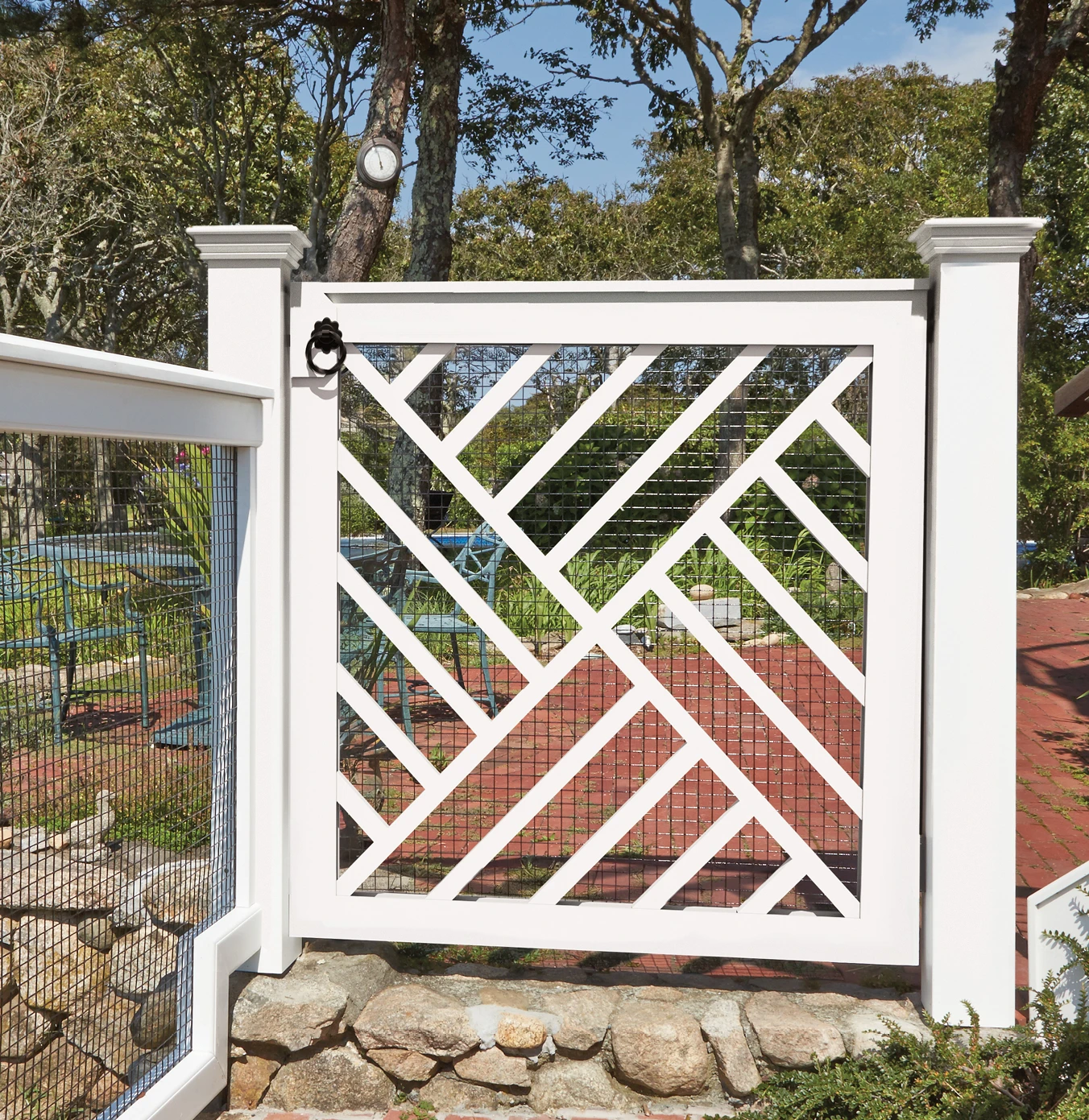 This distinctive gate adds architectural interest with a unique pattern of diagonal lines. Can be purchased with or without wire. Shown in photo with 5.5" sq posts and wire. Crafted in solid cellular vinyl and prefinished white. Side fence sections sold separately.