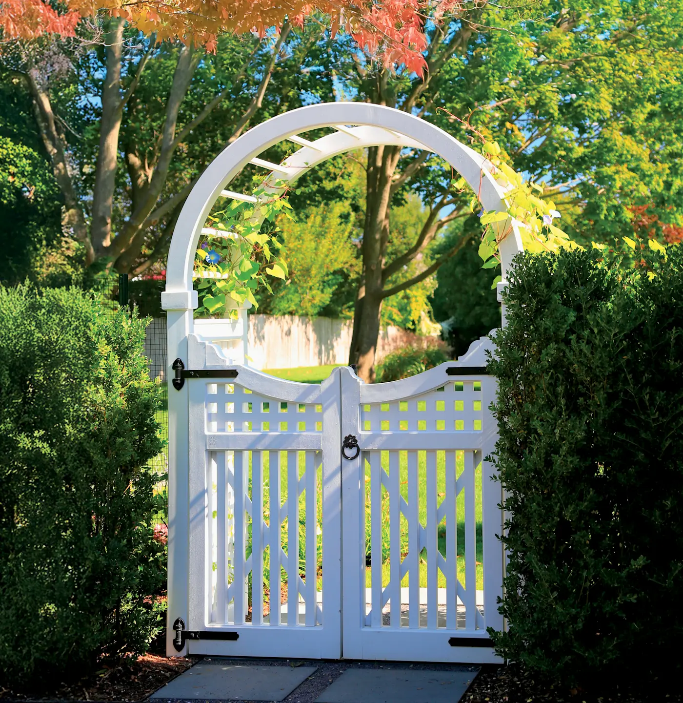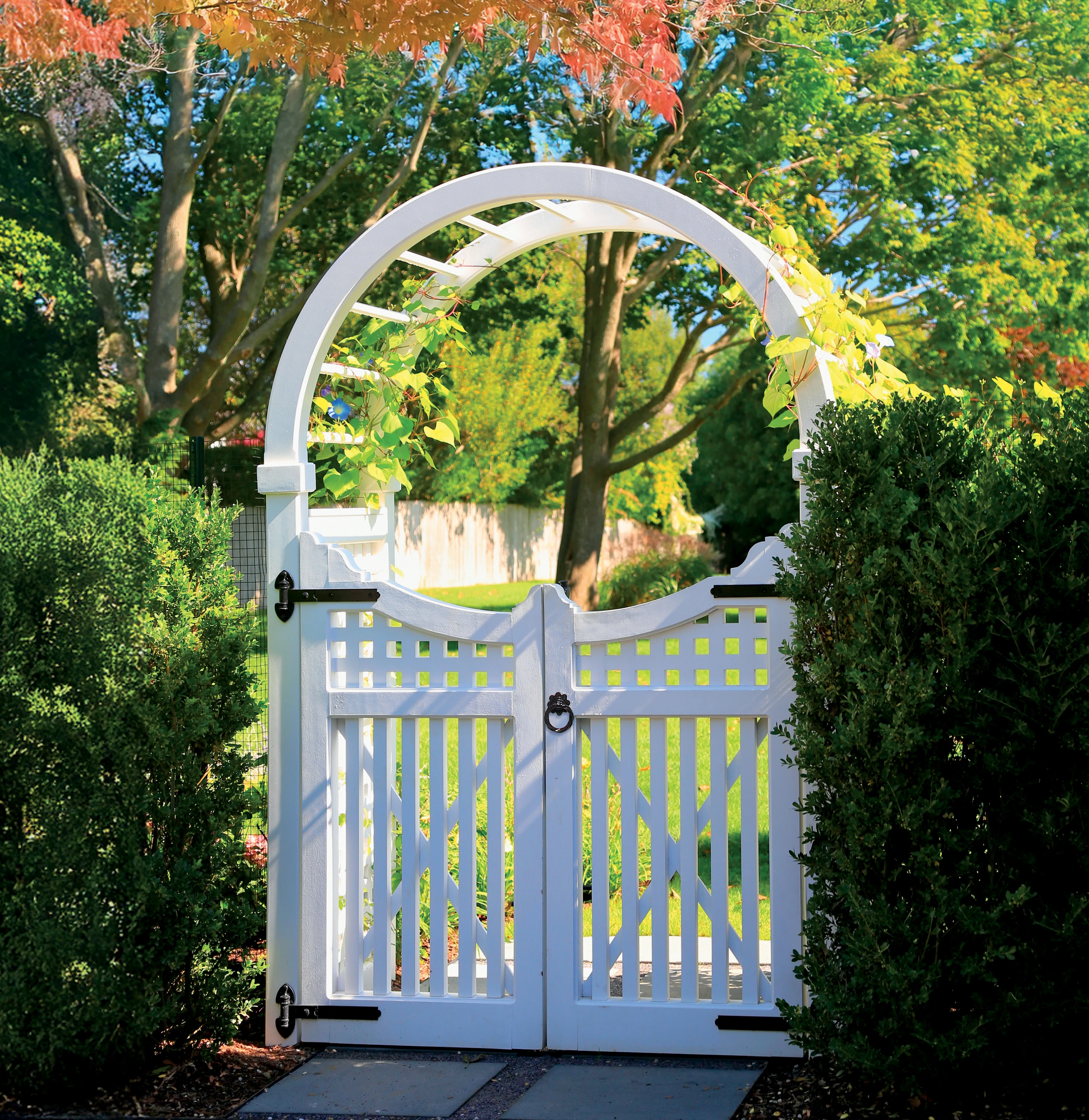 The Hampton double gate (arbor sold separately) has decorative styles and a scallop top that curves from 5' H to 4' 4" H at center. The picket has a half-lapped lattice topper and includes black powder coated 12" heavy reversible hinges, a ring latch and cane bolt. Choose an arbor of your choice, 5½" posts and caps (both sold separately), or place between your existing supports. Prefinished white.